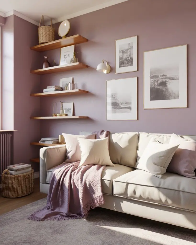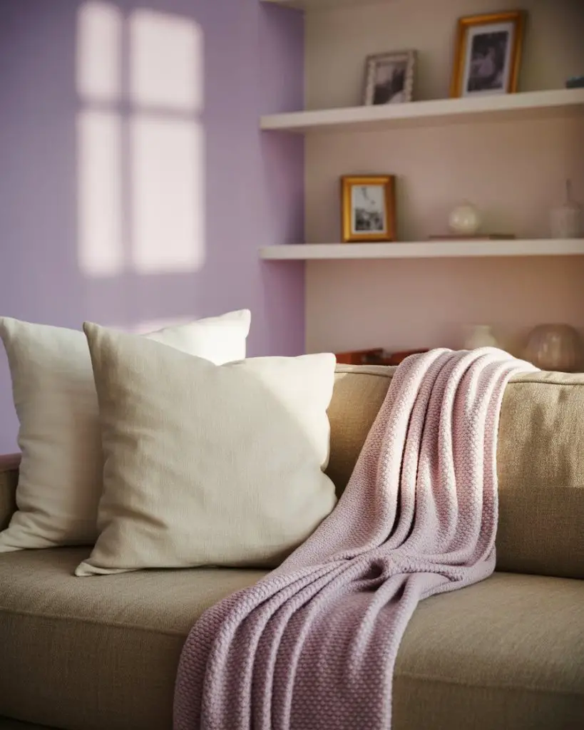 This works best in living rooms that get soft, diffused light—north-facing rooms or spaces with sheer curtains. Harsh, direct sunlight can make lavender look washed out or too pink. If you’re in a sunny climate, consider using lavender as an accent color in textiles and art rather than on the walls, and keep the main walls a warm, light gray.