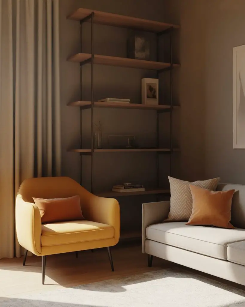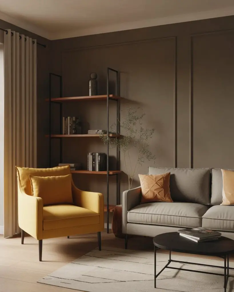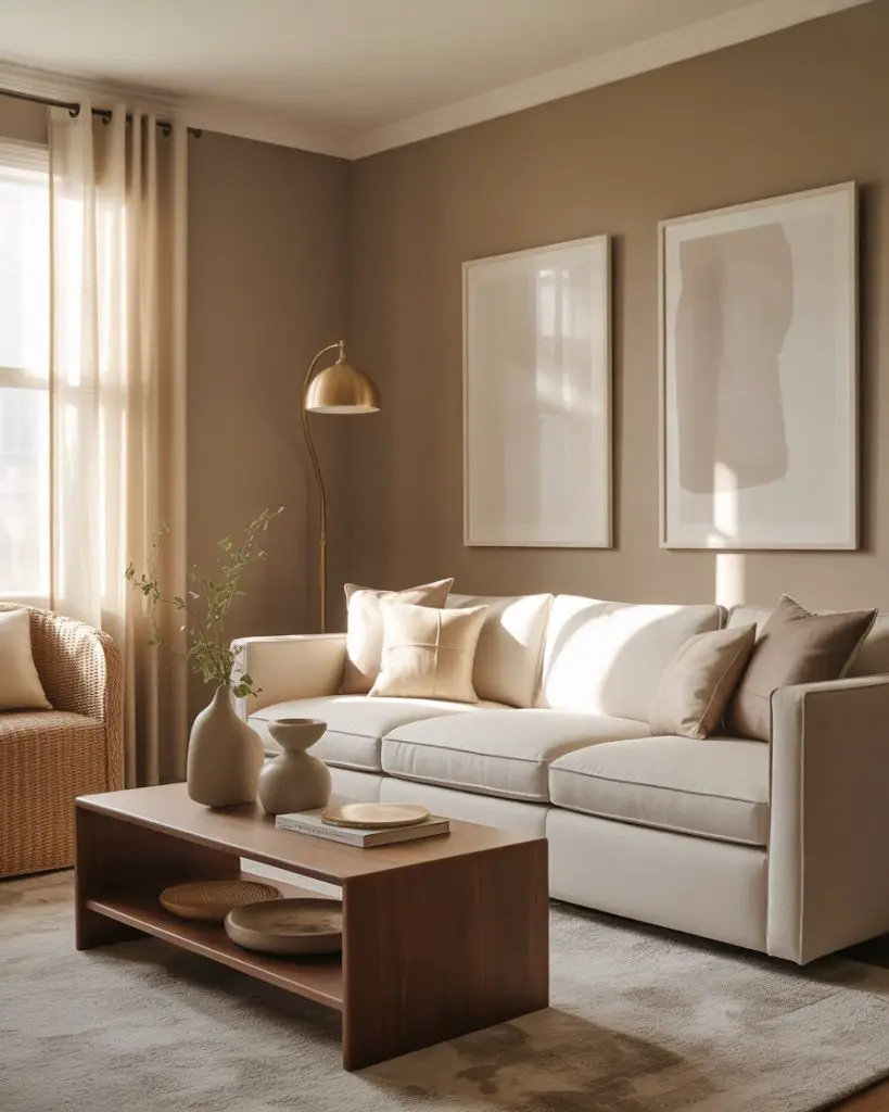 Taupe has quietly become one of the most versatile neutral options for living rooms, especially when paired with warm metallics like brass or aged gold. It’s softer than gray, warmer than beige, and works beautifully as a full-room color or as an anchor for more colorful accents. This palette feels timeless and elegant without being too formal or stuffy.