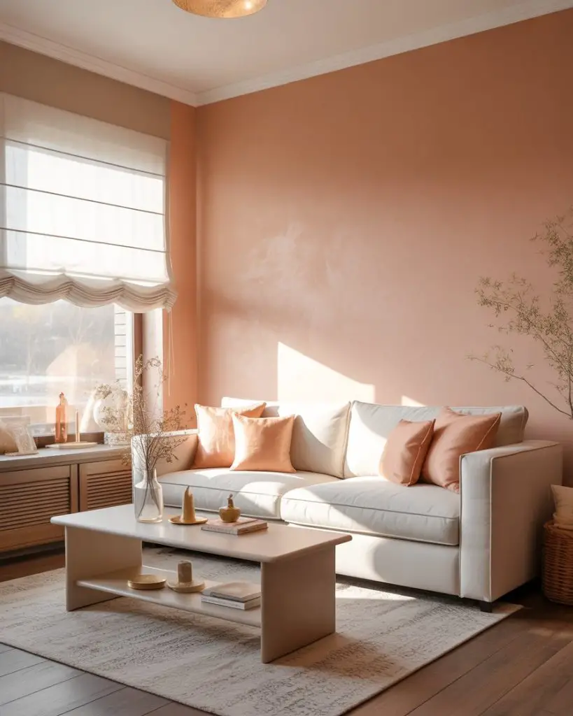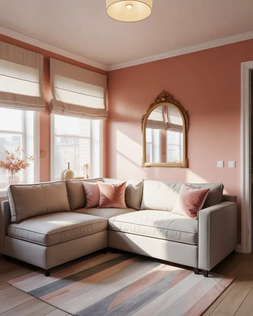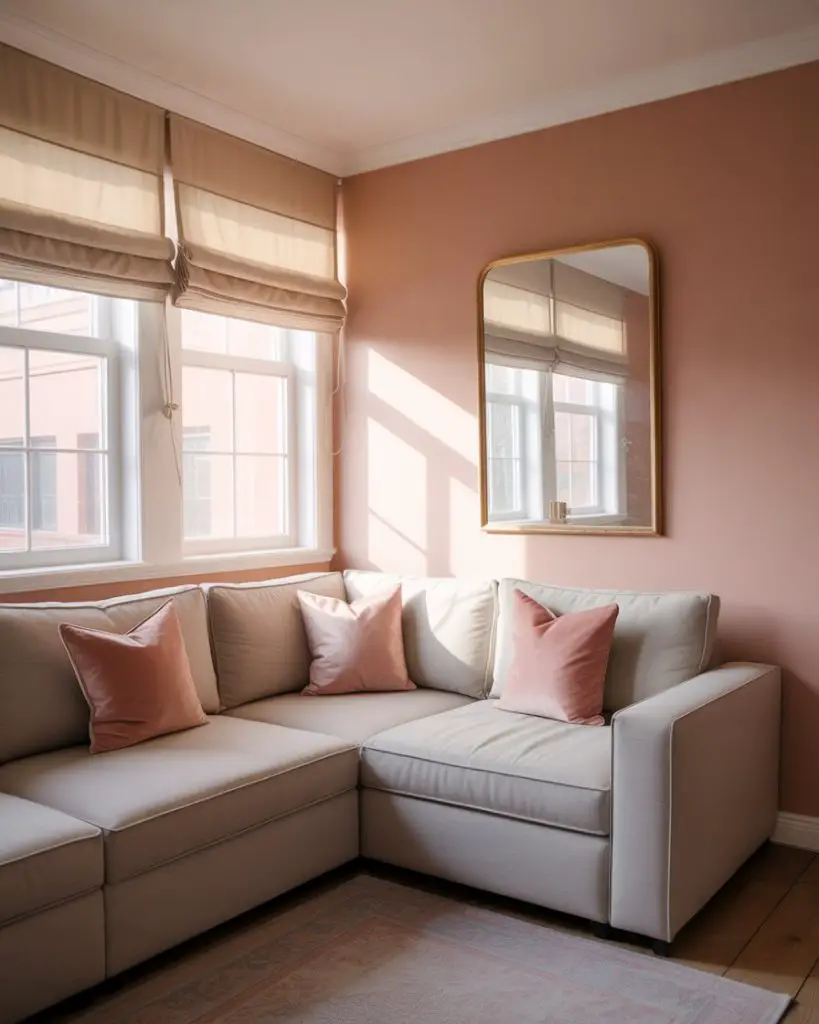This palette works best in living rooms with plenty of natural light, where the blush stays soft and doesn’t veer too peachy. If your space faces north or gets limited sun, swap the blush for a warmer terracotta or apricot tone instead. Real homeowners often use this scheme in condos and townhomes where they want color that feels current but won’t alienate future buyers.