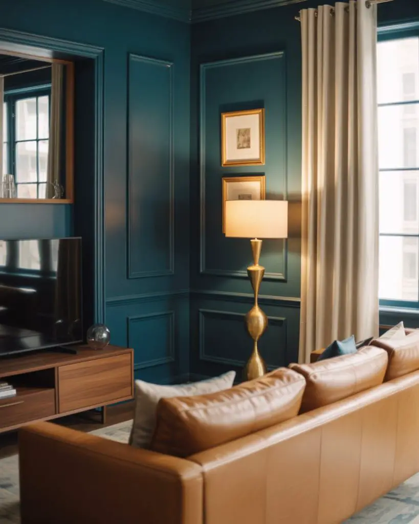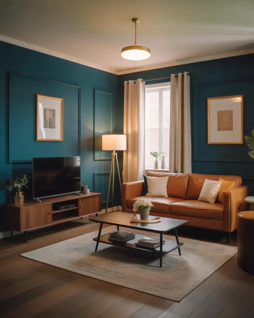 Deep teal is a showstopper color thatworks surprisingly well in living rooms when balanced with warm walnut furniture and brass or gold accents. This palette feels luxurious and intentional, perfect for homeowners who want a designs approach that’s both bold and timeless. The walnut adds warmth and prevents the teal from feeling too cool or jewel-box intense.