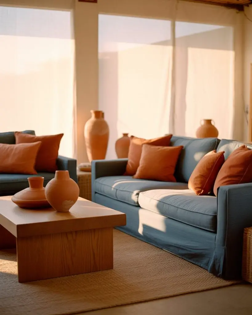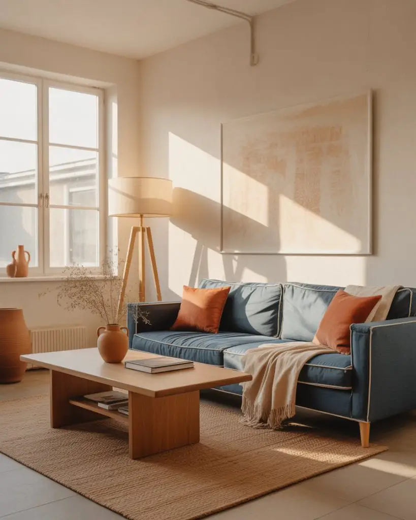 Warm white walls act as a perfect canvas for layering in terracotta and denim blue accents, creating a casual, collected look that feels both modern and timeless. This scheme ideas approach works especially well in living rooms that lean coastal, bohemian, or modern farmhouse, where you want a relaxed vibe without sacrificing style. The terracotta brings warmth while the denim adds a cool, grounding contrast.