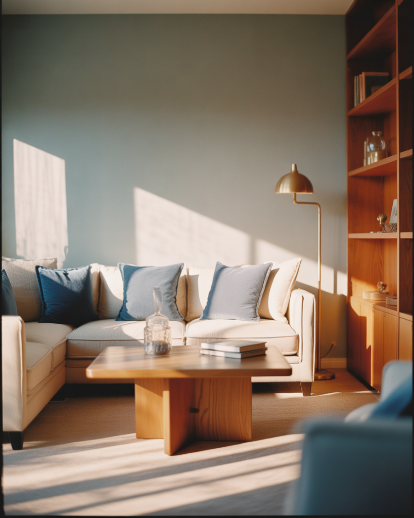 Soft gray-blue sits at the intersection of calm and sophisticated, offering a cozy alternative to stark white or cool gray. When paired with warm honey-toned wood and brass or gold accents, it creates a living room that feels both modern and inviting. This palette works beautifully in spaces that want a touch of color without going bold or saturated.