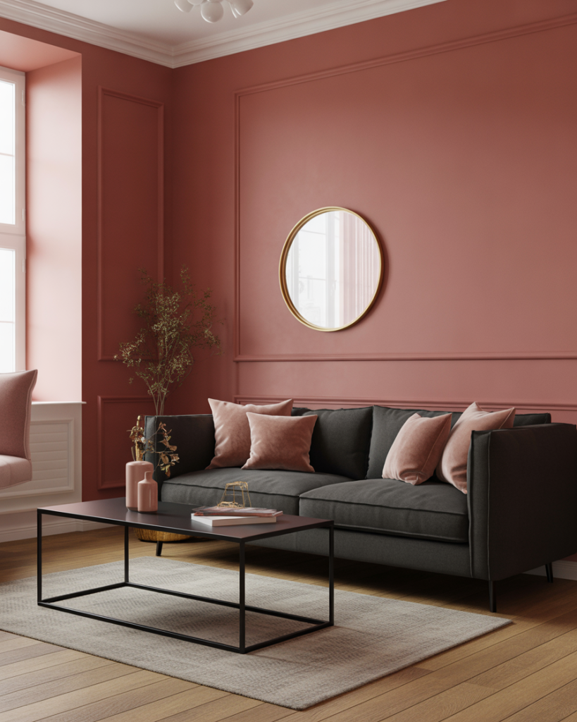Dusty rose brings a sophisticated, grown-up edge when paired with charcoal gray or black accents. This scheme ideas cozy approach is especially popular in urban apartments and townhomes where homeowners want a feminine touch without going full pastel. The charcoal grounds the rose, making it feel moody and intentional rather than overly sweet.
