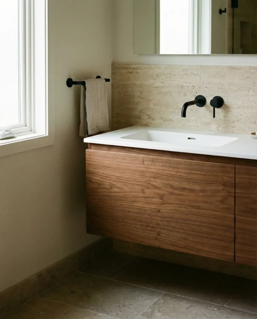 Matte black fixtures have moved firmly from trend to standard in American primary bathrooms, and in 2026 they’re being used with more sophistication than ever. Rather than applying them to every surface, designers are pairing matte black faucets and towel bars with warm materials—travertine tile, wood vanities, linen textiles—to prevent the look from going cold. The contrast is striking without being harsh. This works particularly well in neutral bathrooms where you want one strong grounding element that reads as intentional or in grey bathrooms where the black adds depth without increasing the coolness of the palette.