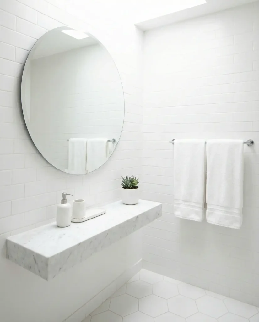 This is also one of the best palettes for resale value. Real estate agents in markets like Boston, Chicago, and Los Angeles consistently note that white bathrooms with stone and warm metal tones photograph best and generate the most positive buyer response during showings. It reads as clean, cared-for, and move-in ready—qualities that translate directly to offers. If you’re renovating with resale in mind, this is the combination to trust. It’s a space that photographs well for listings and lives well for the years before you’re ready to sell.
