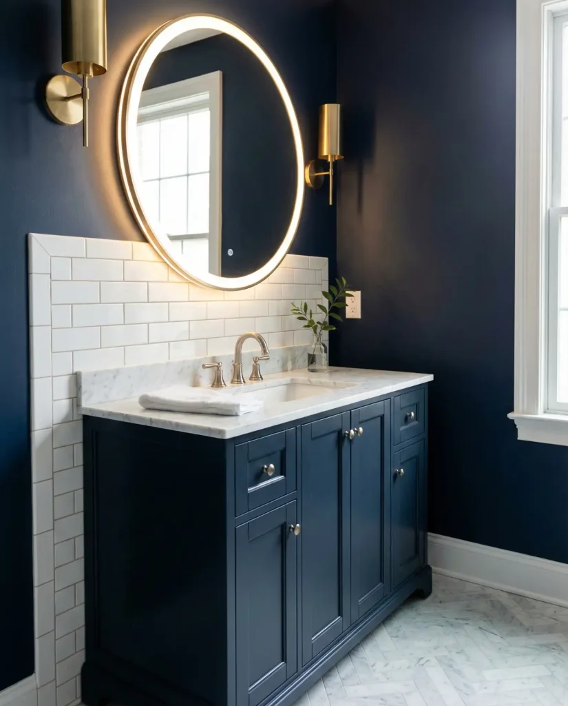 Few colors feel as naturally suited to the bathroom as blue—it reads as clean, calm, and watery without any effort. In 2026, the entire spectrum is in play: powder blue wainscoting in a guest bath, cornflower blue zellige tile in a small full bathroom, or midnight navy in a dramatic primary suite. The palette shifts depending on how much natural light the room gets and how bold you’re willing to go. For light-starved bathrooms, lighter blues with warm white trim read beautifully. For bathrooms with generous windows, deeper blues can absorb the light in a way that feels luxurious rather than heavy.