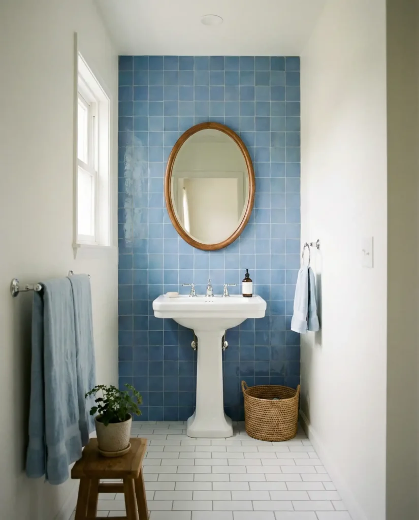 An expert styling note worth internalizing: if you’re going blue in a bathroom, grout color matters more than almost anything else. White grout with blue tile can make the space feel like a swimming pool—very literal and a bit cold. Try a soft grey or stone-colored grout instead; it lets the blue breathe and gives the tile more visual complexity. In terms of accessories, natural wood, rattan, and aged brass tones all complement blue beautifully and bring the palette off the walls and into the room in a way that feels layered and intentional.