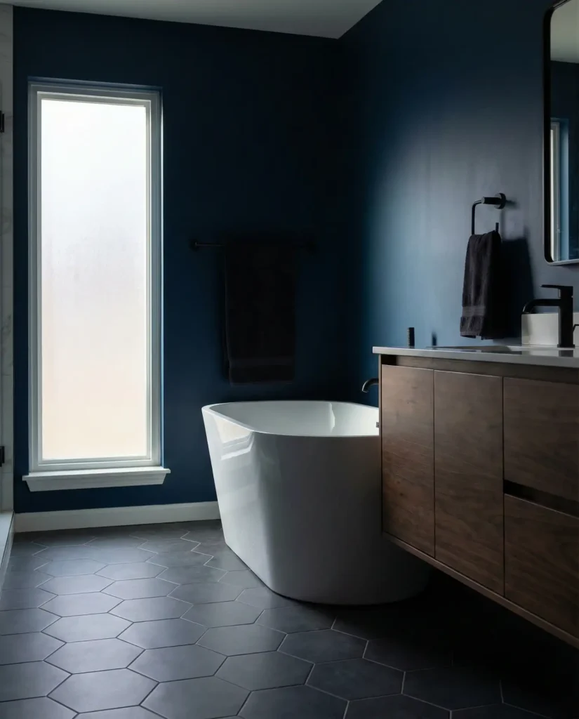 Going dark in a bathroom used to feel risky. Now it’s one of the most-pinned aesthetics of 2026. Deep navy walls paired with charcoal penny tile and matte black hardware create a space that feels both dramatic and intimate—the kind of room you want to linger in. This palette works especially well for modern primary bathrooms where the architecture has clean lines and minimal ornament. The contrast with white porcelain fixtures makes the dark walls pop without feeling oppressive, and the result is a room that photographs beautifully from every angle.