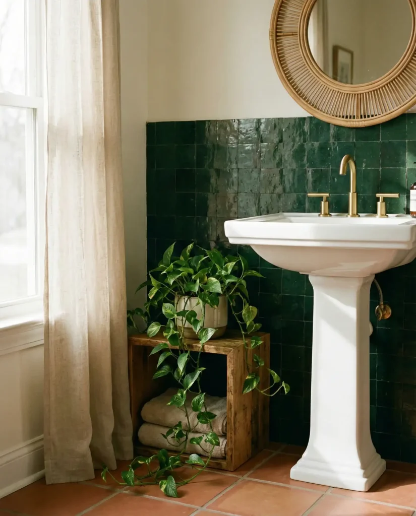 Practically speaking, the bathroom is actually one of the best rooms for houseplants. The humidity from daily showers is a gift to tropical varieties like ferns, snake plants, pothos, and bird of paradise. A bathroom plant collection doesn’t need to be elaborate to make an impact—even a single trailing philodendron on a floating shelf beside the mirror changes the whole energy of the room. One thing to plan for: if your green tile is very saturated, keep your fixtures and countertops lighter so the room doesn’t go too dark.