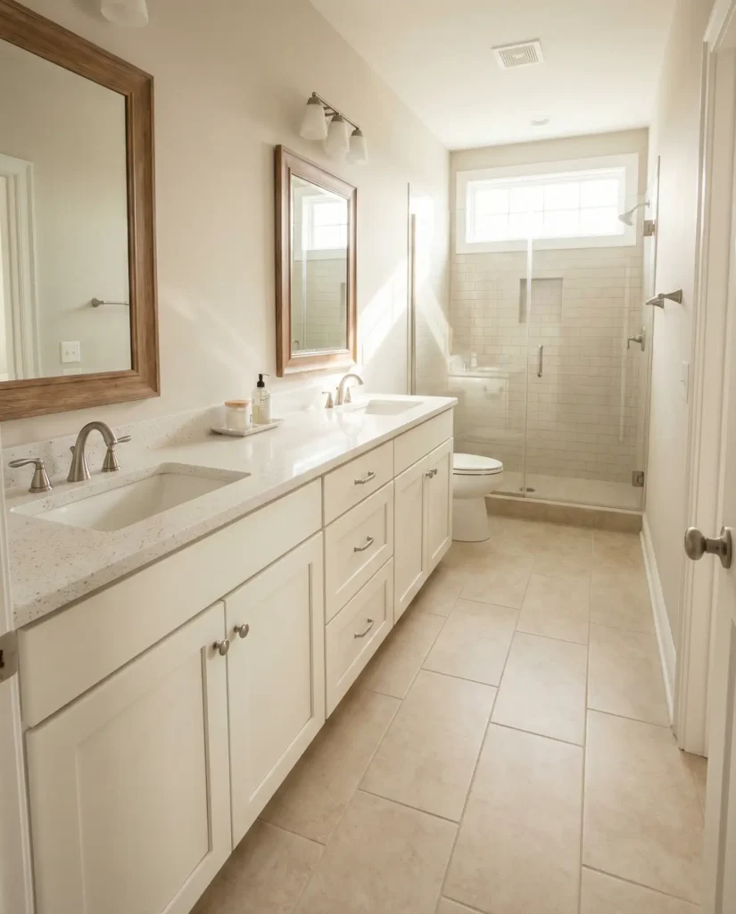 One practical truth about shared vanities in a couple’s primary bath: the layout matters more than the materials. The most beautifully tiled bathroom becomes a daily friction point if both people are reaching for the same drawer or competing for the same outlet. Design the storage so each person has clearly delineated zones—dedicated drawers, individual medicine cabinets, and separate outlet locations. It sounds utilitarian, but it’s the detail that couples who’ve done it right consistently cite as the most underrated upgrade in their entire renovation. Good relationships and good bathroom design share at least one trait: clarity about space.