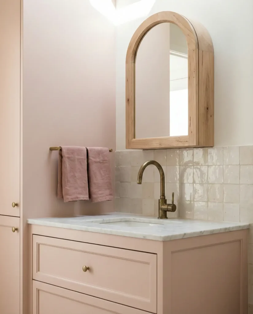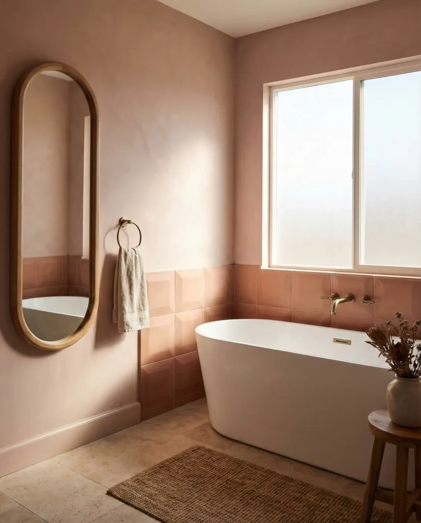 The pink bathroom is back, and it has grown up. The 2026 version isn’t the bubblegum pink of the 1950s or the millennial pink blush tile of a decade ago—it’s deeper, more complex. Think dusty rose plaster walls, terra-cotta blush tile in a wide beveled profile, and warm brass fixtures that deepen the whole composition. It’s a palette that reads as cute in smaller doses but genuinely sophisticated when you commit fully to it. The key is treating pink as a foundational neutral rather than an accent—ground it in stone and brass, and it loses its preciousness entirely.