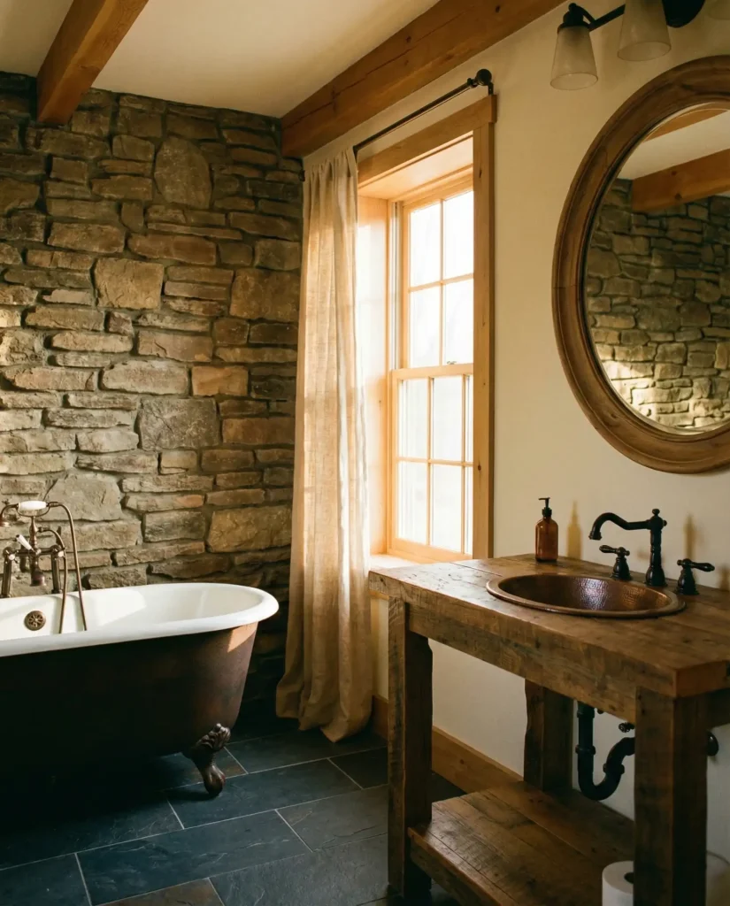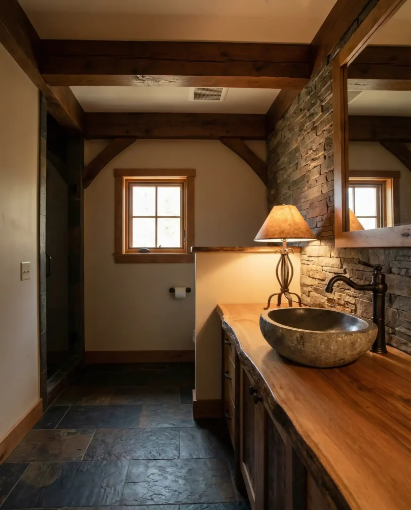 Where this look works best is in homes that already have natural material bones—exposed timber framing, stone foundations, or wood-paneled ceilings. Forcing a rustic palette onto a very modern, glass-and-steel home can feel incongruent. But if the architecture has even a hint of organic warmth, a rustic primary bath feels like the natural conclusion. The materials themselves are also more durable than they look—slate tile is dense and scratch-resistant, and properly sealed wood vanities hold up well in humid environments when they’re maintained annually.