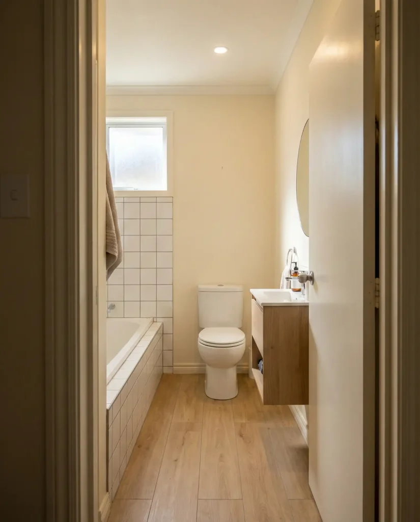 One underrated trick for small bathrooms is the pocket door. Swinging doors eat up a surprising amount of usable floor area—a pocket or barn-style door that slides along the wall reclaims that square footage instantly. For storage, go vertical: open shelves stacked to ceiling height draw the eye upward and make the ceiling feel taller. Where this layout works best is in older homes where bathrooms were built small as an afterthought—the constraints are real, but the design creativity they inspire is often more interesting than what you’d get with a sprawling footprint.