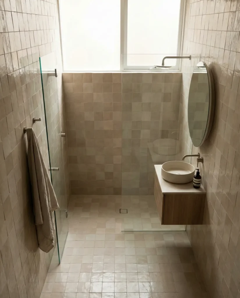 If you’ve been afraid that neutrals will look boring, this is the approach that changes minds. The trick designers swear by is keeping your grout a shade or two warmer than your tile—stark white grout on warm stone immediately cools everything off. A touch of terracotta in your towels or a wood-framed mirror also goes a long way. Where it works best: south-facing bathrooms that get plenty of natural light and can handle a deeper, earthier base tone without going dim.