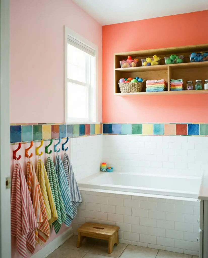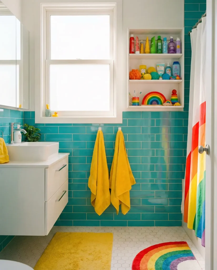 The practical insight here is about commitment levels. Full tile renovation in a bold palette is a long-term decision—paint, accessories, and textiles are not. If you want to test a vibrant, playful bathroom aesthetic, start with accessories and a single accent wall in a paint you love. Paint is removable; grout is not. For families with young kids, a semi-gloss or satin finish paint in the colorful hue cleans up far better than matte, which tends to absorb soap and water stains over time. Design for the age your kids are now, knowing you can repaint in five years if the vibe needs to shift.