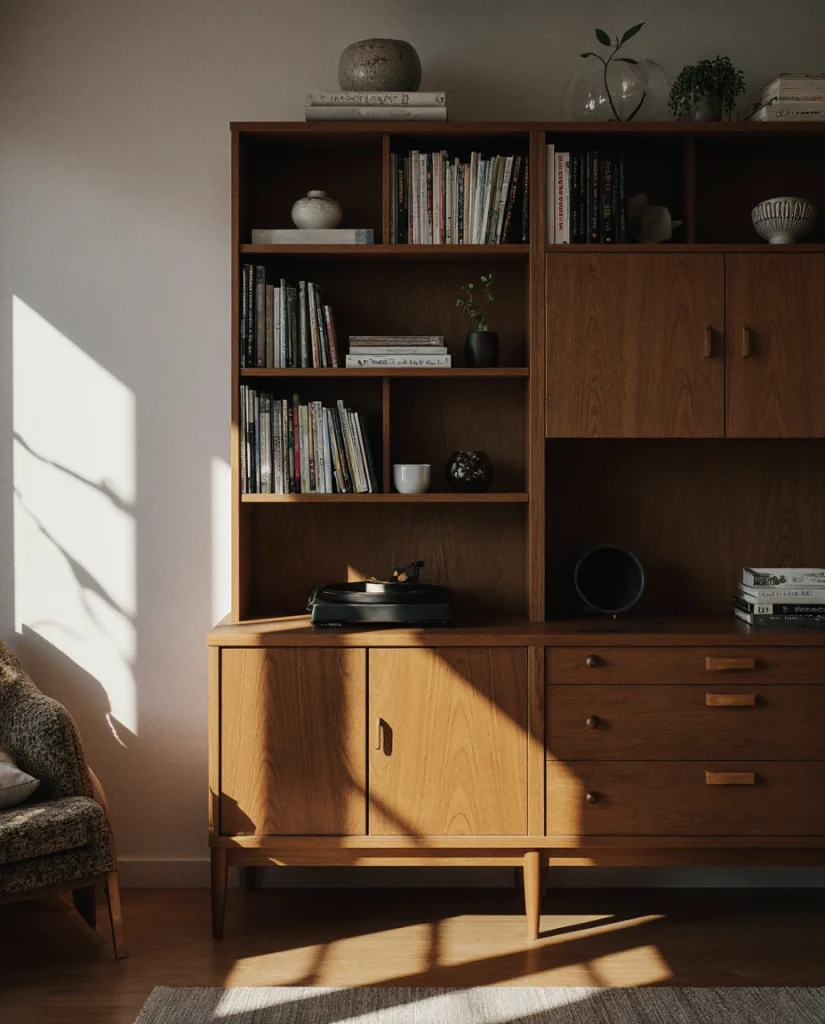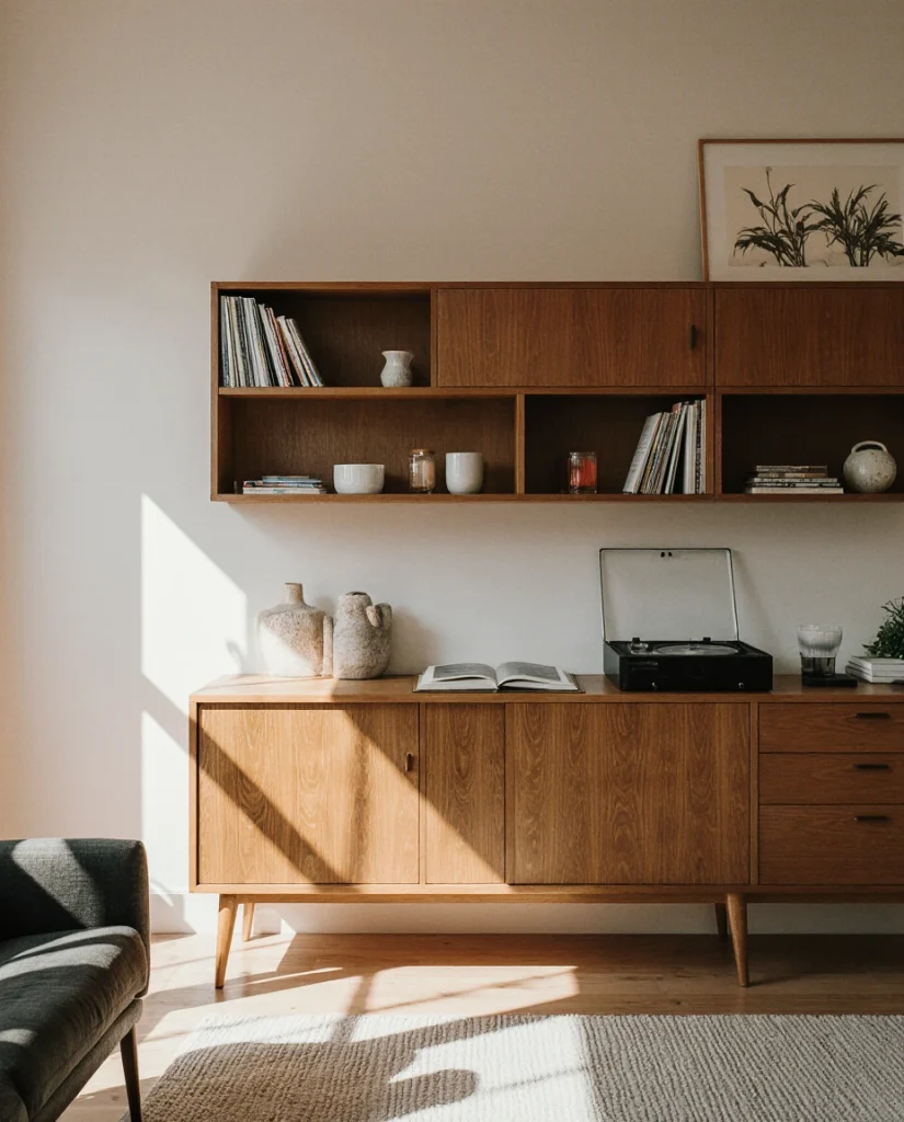 Modular shelving units like vintage Cado systems or contemporary String shelves offer the clean-lined storage that mid-century interiors require while providing incredible flexibility for changing needs and spaces. These wall-mounted systems create visual lightness through their suspension, leaving floor space clear and maintaining the style’s emphasis on horizontal flow. The ability to reconfigure shelf heights and add or remove components means the system grows and adapts with you.