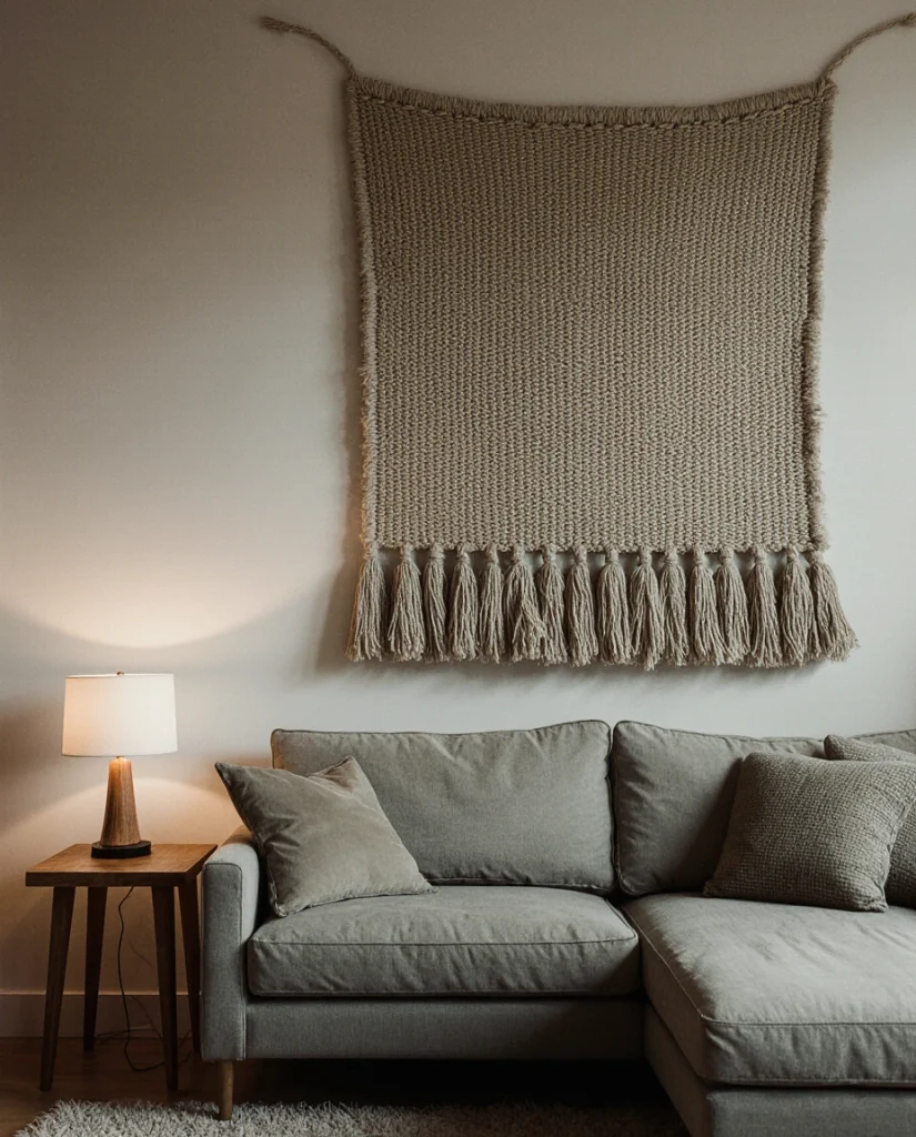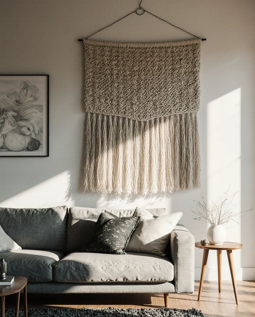 Textiles in the form of macramé and fiber art offer soft texture and handmade warmth appreciated in mid-century modern design. Artworks balance the industrial feel of the style and soften the hard surfaces and provide sound dampening in wood- and glass-heavy spaces. They complement the fibers and neutral color tones of these artworks, which are also perfect for the earthy crafts typical of the days of the period.