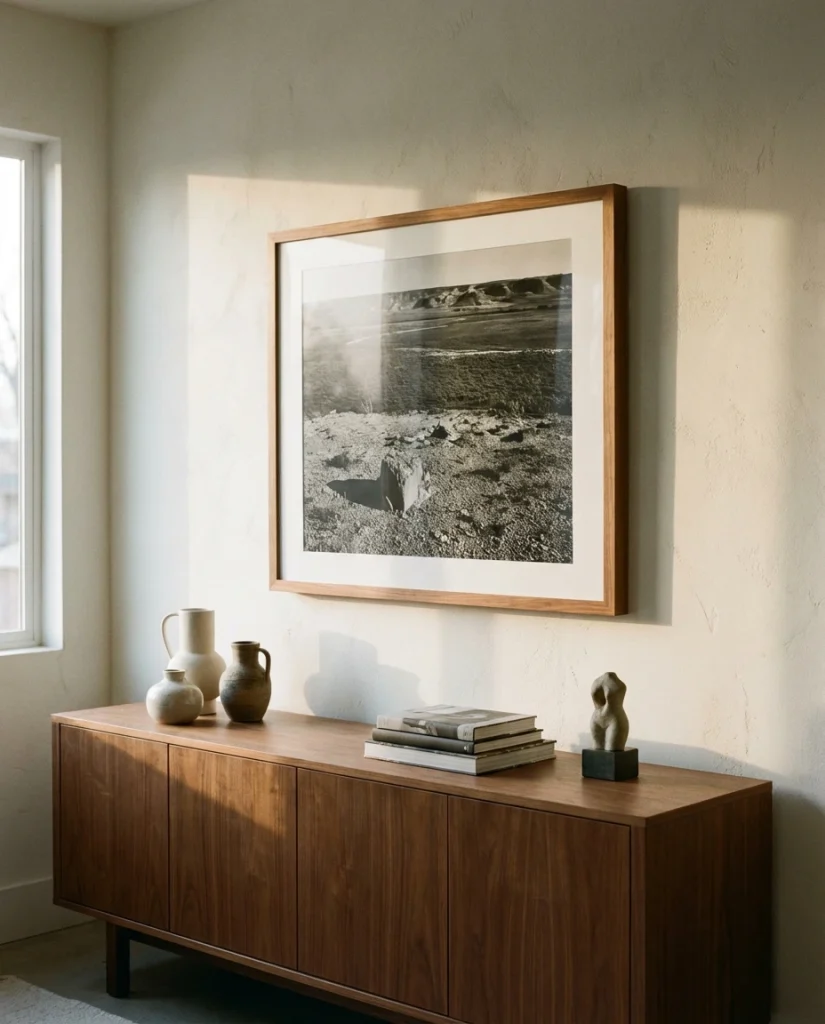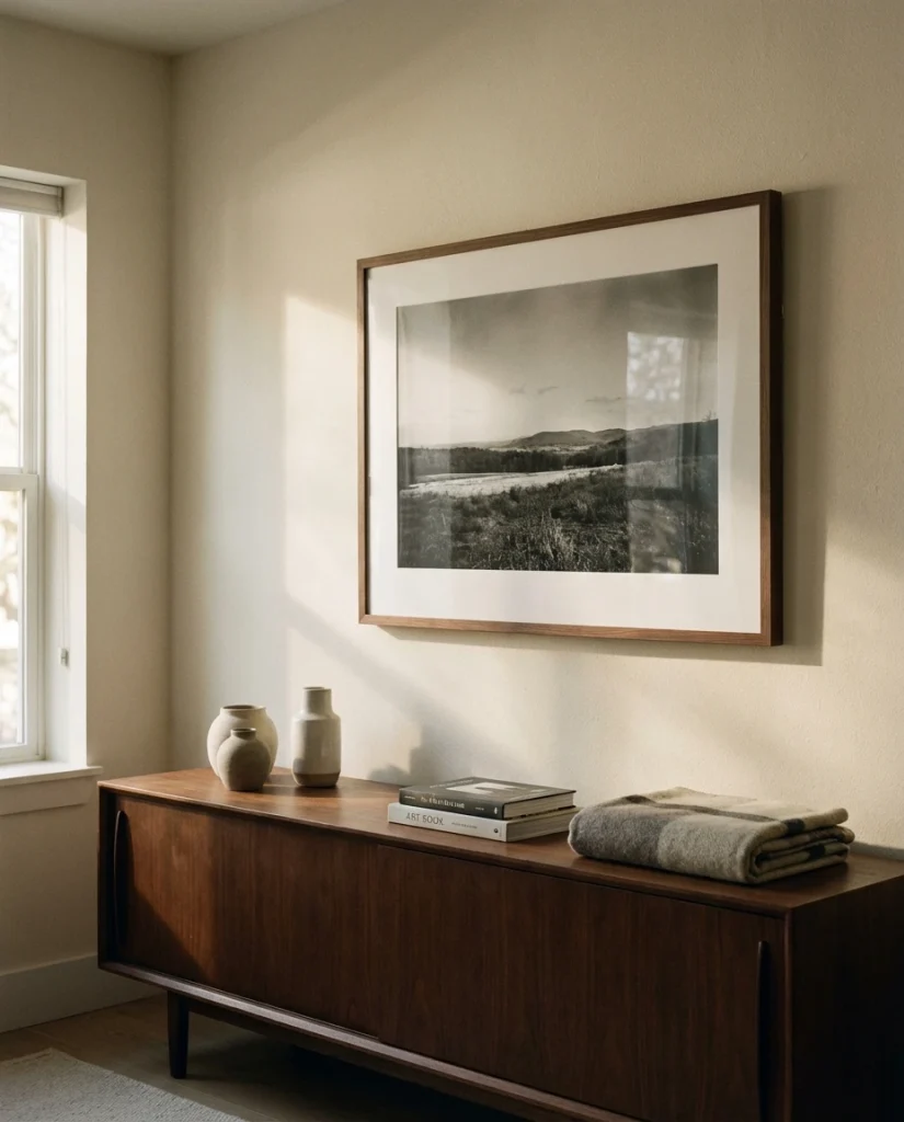 Large-scale black and white photography brings sophisticated visual impact to mid-century modern living rooms without the color complexity that might compete with furniture and textile choices. Architectural photography, abstract compositions, or portraits from the era create strong focal points while maintaining the restrained palette. Oversized prints—thirty by forty inches or larger—make bold statements that honor the period’s appreciation for dramatic scale.