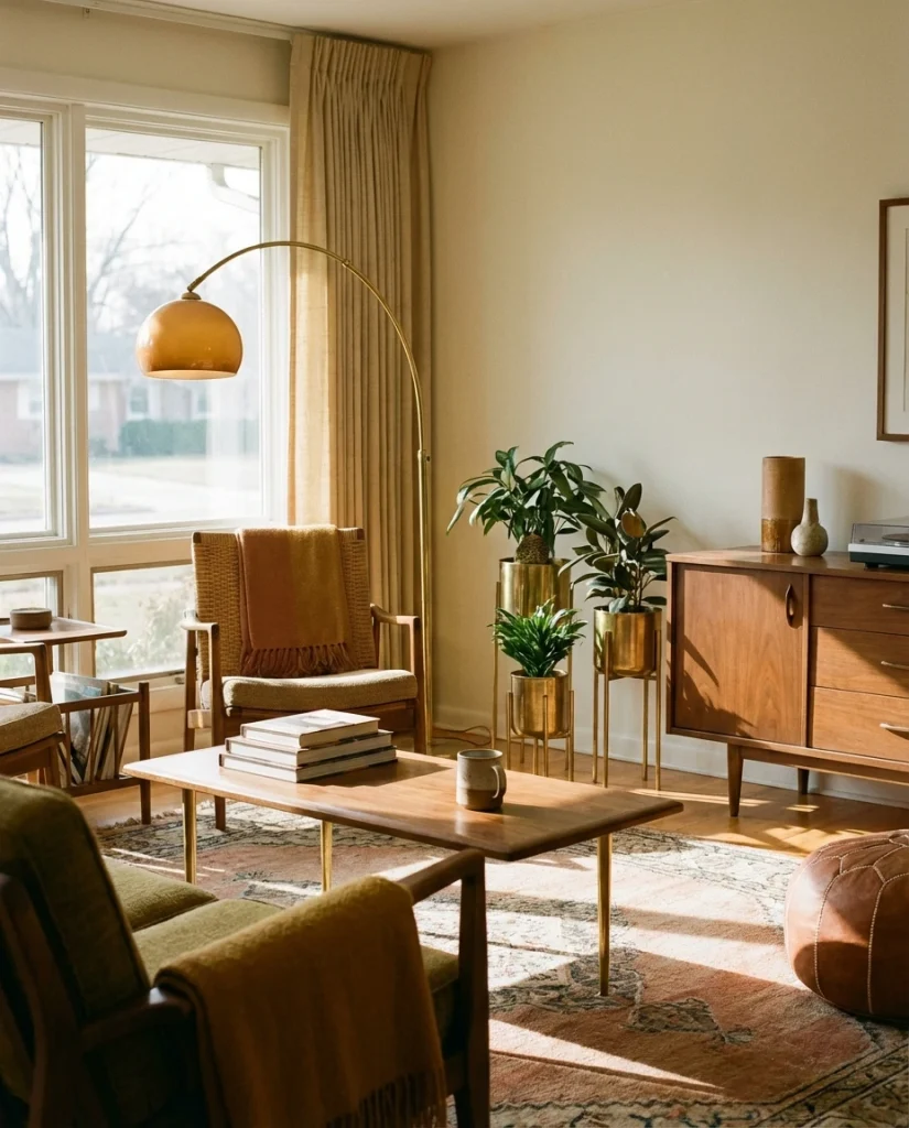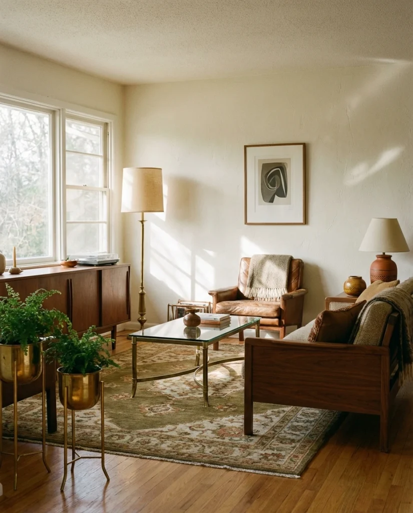 The budget angle here is encouraging—brass-finished pieces don’t require solid brass to achieve the desired effect. Quality brass-plated or PVD-finished items deliver similar warmth at a fraction of the cost, with pieces like table lamps starting around sixty dollars compared to four hundred plus for solid brass. Avoid mixing brass with other metallics like chrome or nickel in mid-century spaces; the warm metals were period-appropriate, while cooler tones feel anachronistic unless you’re intentionally pursuing a contemporary fusion aesthetic.