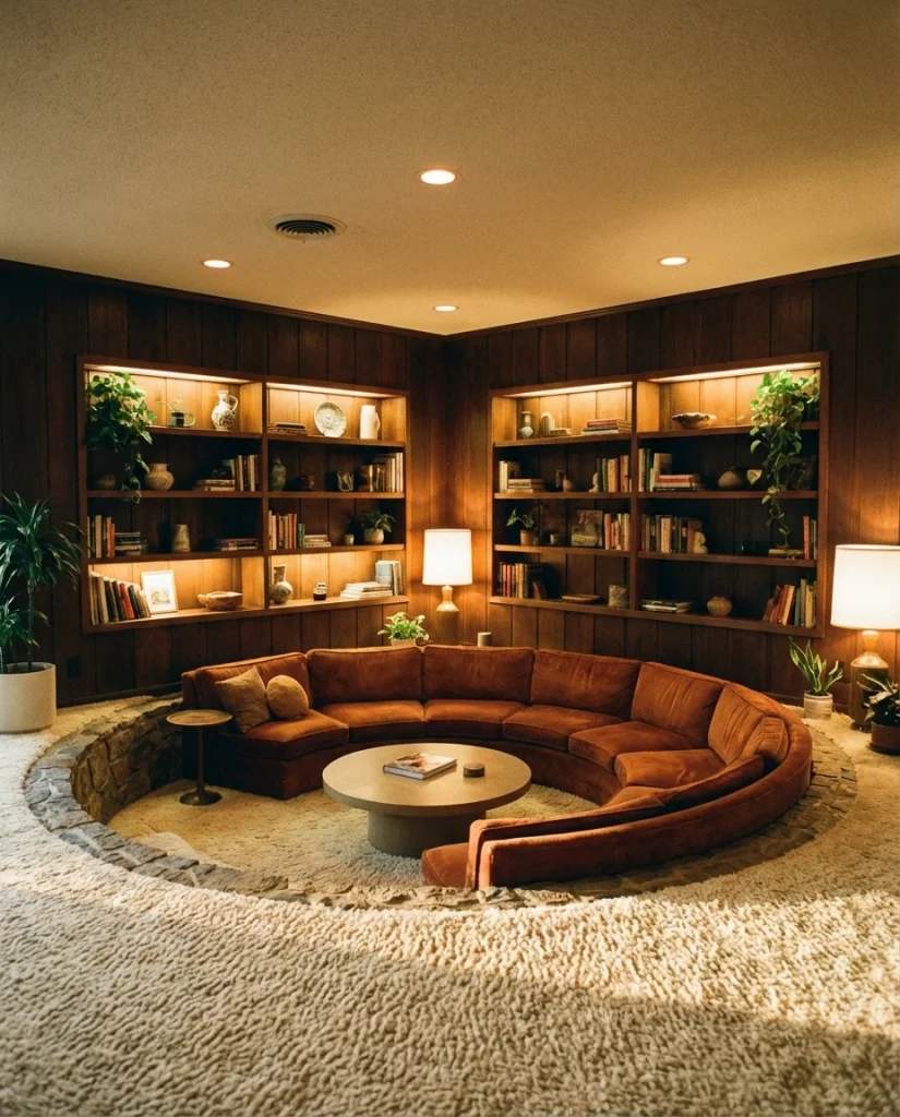 The conversation pit is making a dramatic comeback in 2026, transforming living rooms into intimate gathering spaces that feel both retro and remarkably relevant for today’s focus on intentional entertaining. This architectural feature creates natural zones within larger spaces and encourages face-to-face interaction in ways that traditional furniture arrangements can’t quite achieve. Whether you’re working with an existing sunken area or considering a renovation, the mid-century aesthetic provides the perfect framework with low-profile seating and clean-lined built-ins.