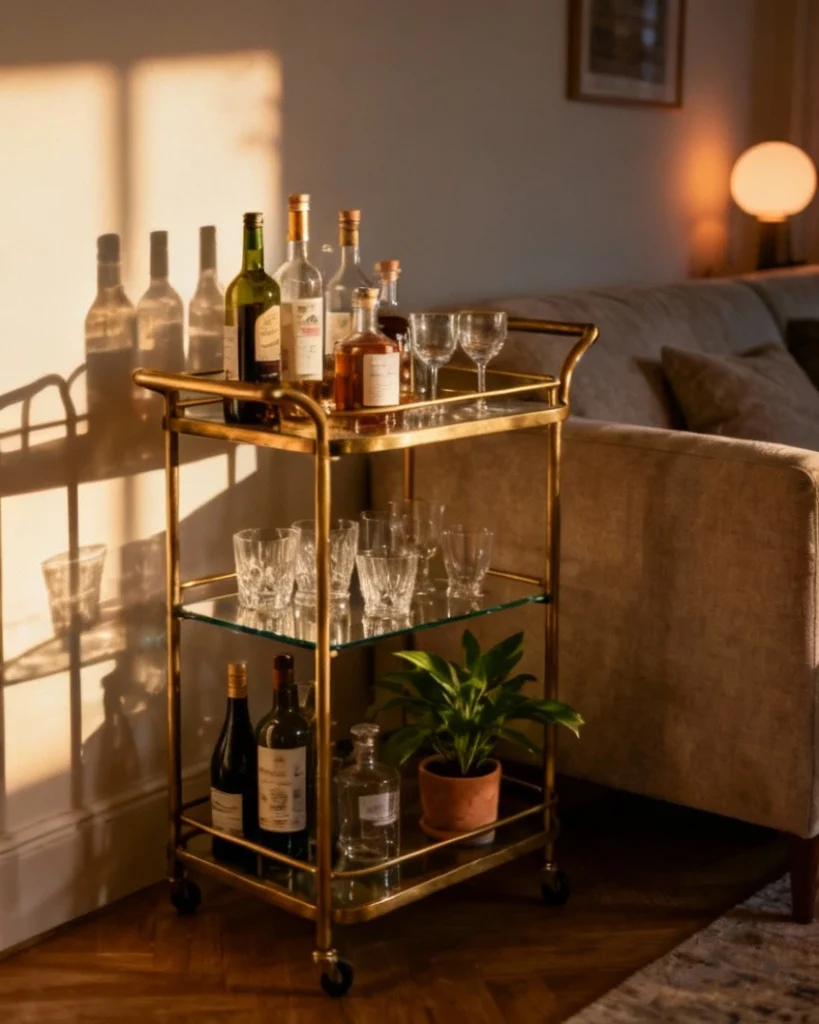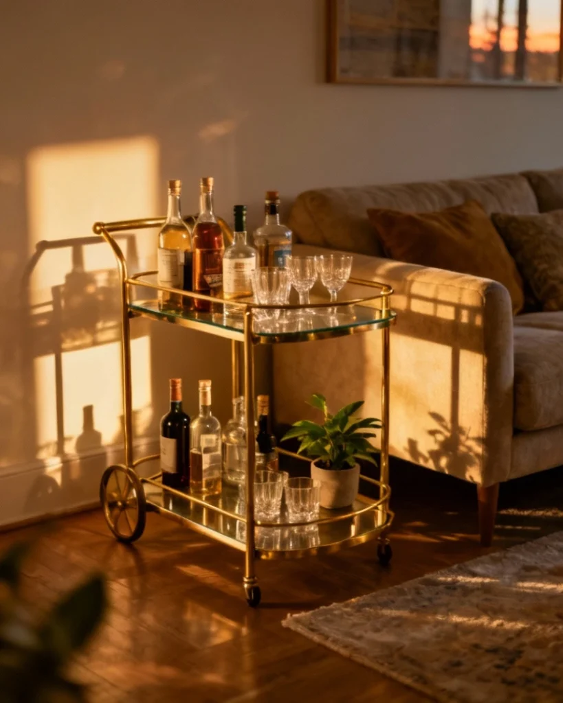 Bar carts function particularly well in boho-influenced mid-century spaces where the slightly eclectic mix of objects feels at home. Real homeowners often use these for purposes beyond cocktails—coffee stations, plant displays, or even book storage—which speaks to their versatility beyond the Instagram-perfect martini setup. Vintage carts range from one hundred fifty to six hundred dollars depending on condition and maker, while quality reproductions start around one hundred twenty dollars for basic models.