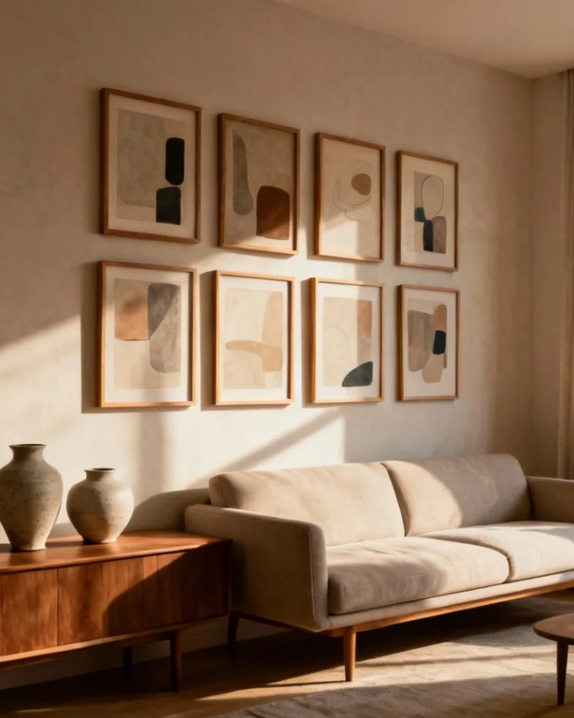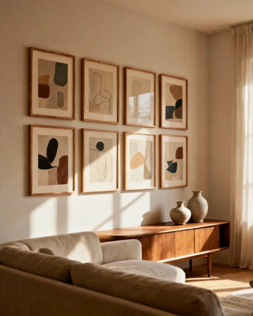 A thoughtfully curated gallery wall brings personality and visual interest to mid-century modern spaces without competing with the furniture’s clean lines. Focus on vintage abstract prints, architectural drawings, and black-and-white photography from the 1950s and 60s that complement rather than overwhelm the room’s aesthetic. The frames themselves become part of the design story—slim wood or metal frames in walnut, teak, or brass finishes maintain the period-appropriate feel.