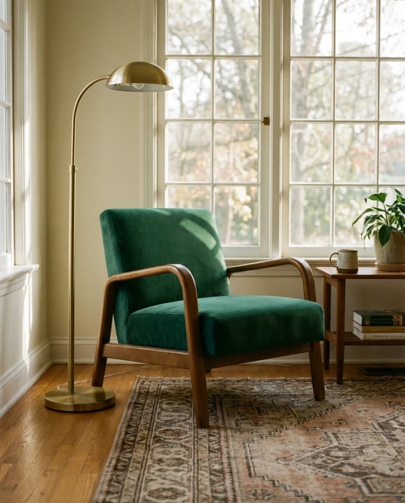 Rich green, sapphire blue, and burnt orange velvet upholstery offer luxurious texture and saturated color to mid-century living rooms, bringing in without sacrificing the clean-lined silhouettes that define the style. A vintage Selig or Thayer Coggin chair reupholstered in deep emerald velvet is an instant focal point, while a velvet sofa in cognac or navy grounds the space with presence, as it is substantial. The subtle sheen on the pile catches natural light throughout the day, dynamically shifting the day with light.
