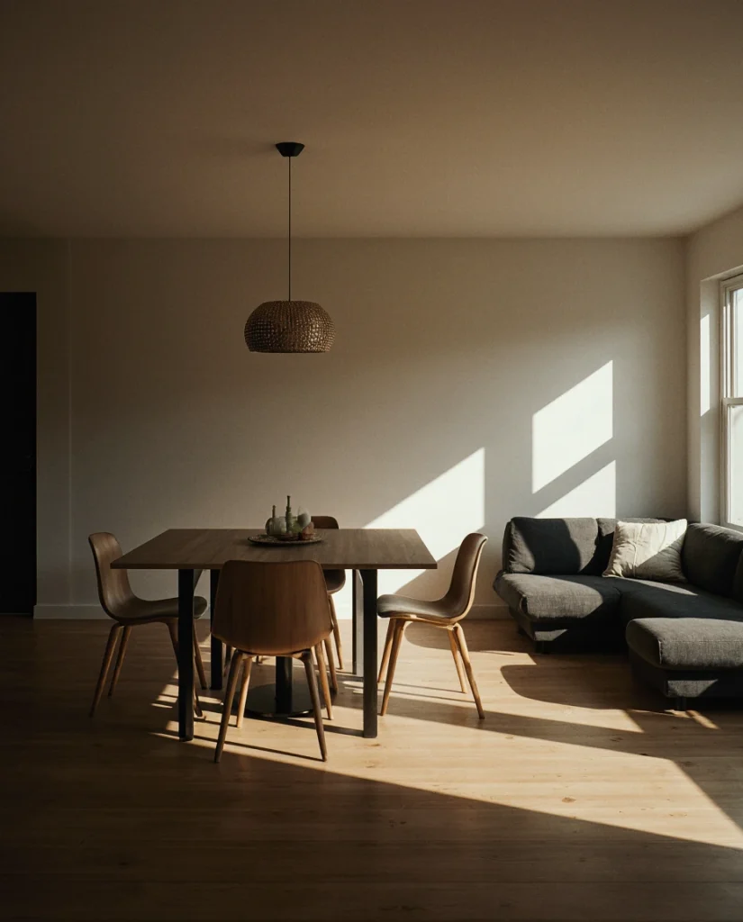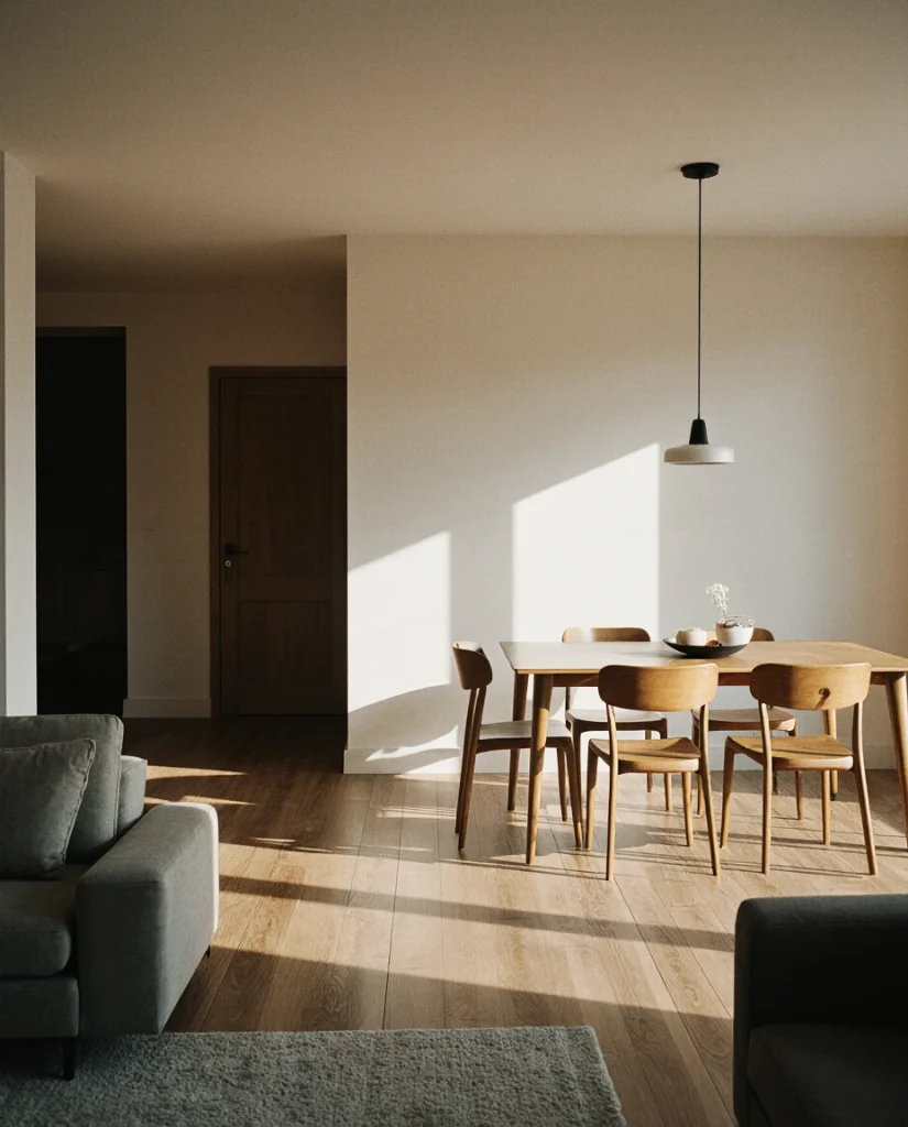 In open-concept homes, a minimalist dining area that flows seamlessly into the living room requires thoughtful spatial definition without walls. A simple wooden dining table with sculptural chairs creates a functional zone while maintaining visual transparency between spaces. The modern approach uses consistent flooring, complementary furniture styles, and unified color palettes to create cohesion. Perhaps the living room features a grey sofa while the dining area introduces grey upholstered dining chairs—subtle repetition that ties spaces together without matchy-matchy coordination.