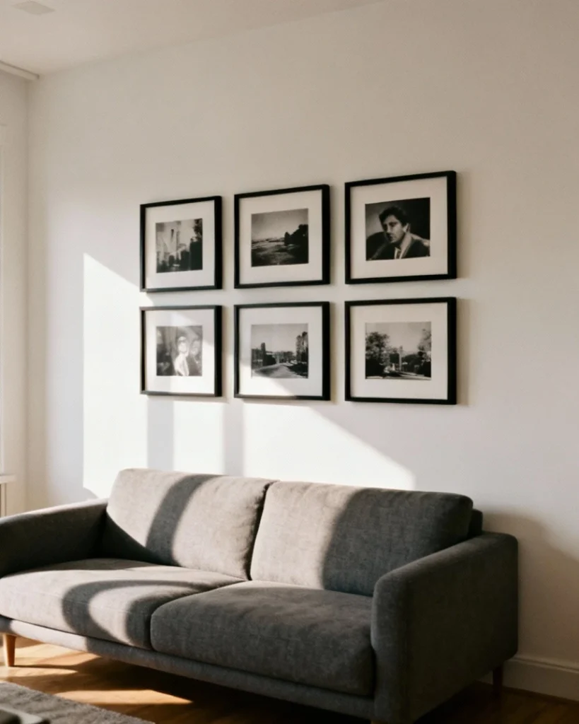 A curated inspiration gallery wall can work within minimalist principles when executed with restraint and consistent framing. Choose a unified frame style—all black metal, all natural wood, or all white matte—and create a simple grid layout rather than a scattered salon hang. The design’s modern luxury approach might feature six identically framed black-and-white photographs in two rows of three. This creates a focal point without the visual chaos that comes from mismatched frames, varied sizes, and competing content. The negative space around the gallery matters as much as the artwork itself.