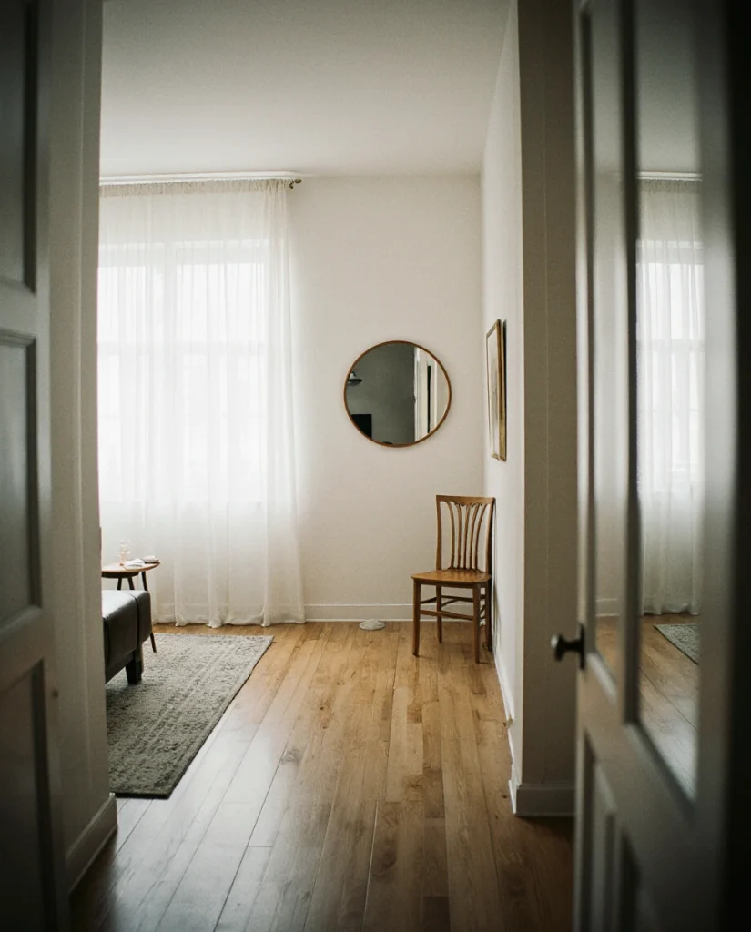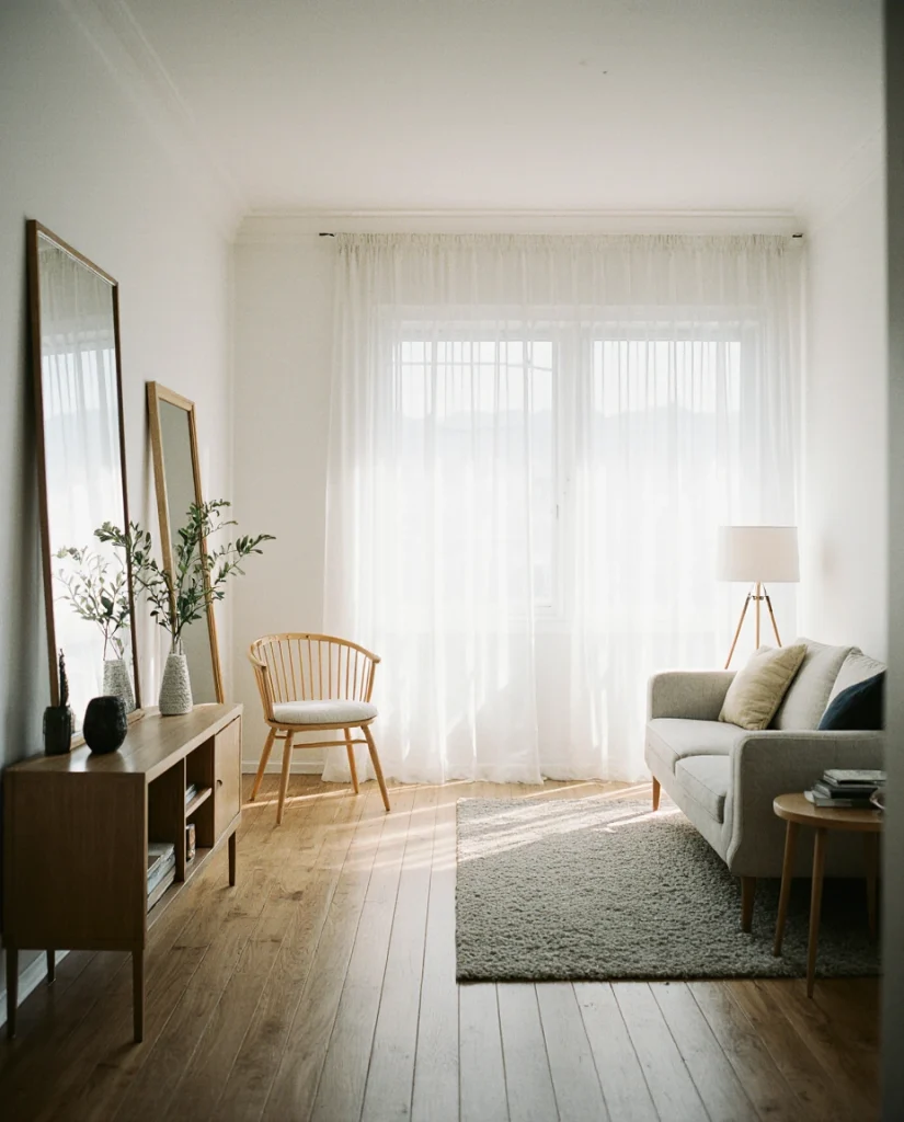 Minimalist living rooms treat natural light as a design element, using window treatments and reflective surfaces to amplify available daylight. Sheer linen curtains, strategically placed mirrors, light wood floors, and white or pale walls bounce light throughout the space. This modern neutral approach recognizes that in minimalist design, where you’ve removed visual complexity, the play of light and shadow becomes entertainment for the eye. South-facing windows might need UV-filtering sheers to protect furniture, while north-facing rooms benefit from mirrors positioned to reflect any available light deeper into the space.