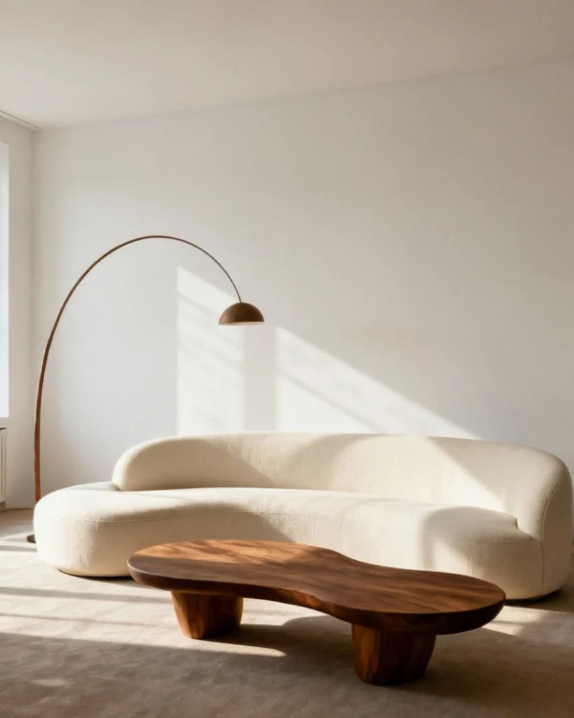 In minimalist living rooms, each furniture piece receives attention, making sculptural forms especially impactful. A curved modern sofa, an organically shaped coffee table, or a dramatic arc floor lamp becomes functional art that doesn’t require additional decoration. The contemporary approach favors pieces with interesting silhouettes that look beautiful from multiple angles—important in open-concept homes where furniture is visible from the kitchen or entryway. These sculptural elements prevent minimalism from feeling too rigid or boxy while maintaining the uncluttered aesthetic that defines the style.
