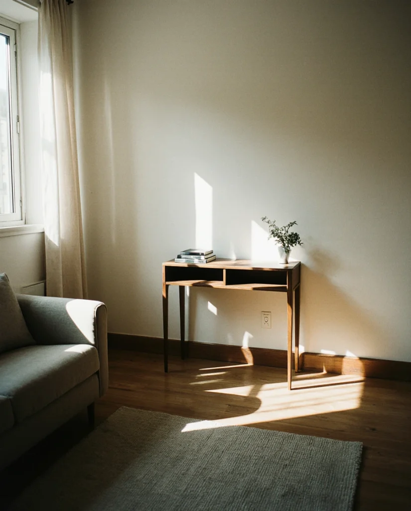 As remote work persists, integrating a workspace into a minimalist living room requires invisible boundaries and dual-purpose furniture. A slim console table behind the sofa doubles as a desk; a laptop stored in a credenza drawer disappears after work hours, or a beautiful writing desk serves both aesthetic and practical functions. The contemporary challenge is creating a productive work environment that can be quickly transformed back into a relaxation space. This requires discipline in cable management, storage solutions, and maintaining the clean surfaces that make minimalism work.