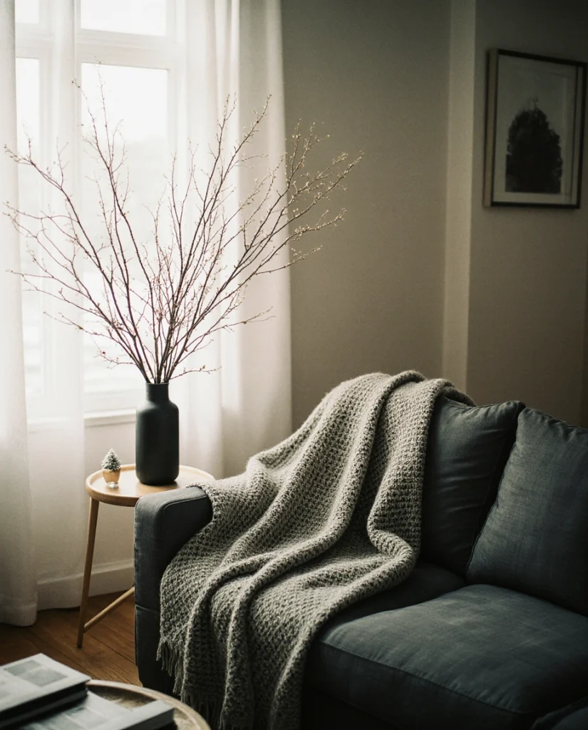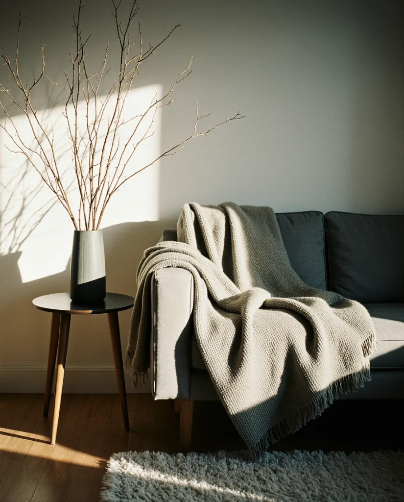 The best minimalist living rooms adapt subtly to seasons through textile swaps and natural elements rather than themed décor. Summer might bring lightweight linen throws and fresh greenery, while winter introduces heavier wool blankets and dried branches. This cozy approach to seasonality maintains the minimalist foundation—same furniture, same color palette—while acknowledging our human desire for variety and connection to the natural world. A single vase of seasonal branches or a swapped throw blanket provides enough change to feel fresh without requiring storage units full of decorations.