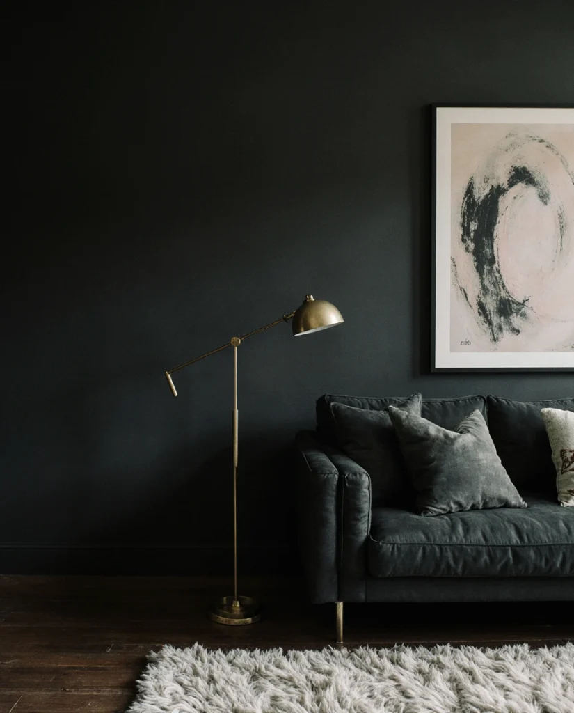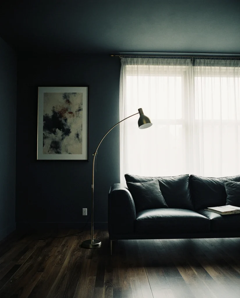 Not all minimalism needs to be bright and airy—dark, moody palettes create living rooms with dramatic depth and sophistication. Charcoal walls, black-stained oak floors, and deep navy accents prove that minimalist spaces can feel cozy and enveloping rather than cold. This contemporary approach works especially well in homes with abundant natural light, where the darkness creates a striking contrast during the day and an intimate cocoon at night. A single pendant light with a warm bulb, a charcoal velvet sofa, and perhaps one piece of abstract art in muted tones complete the look.