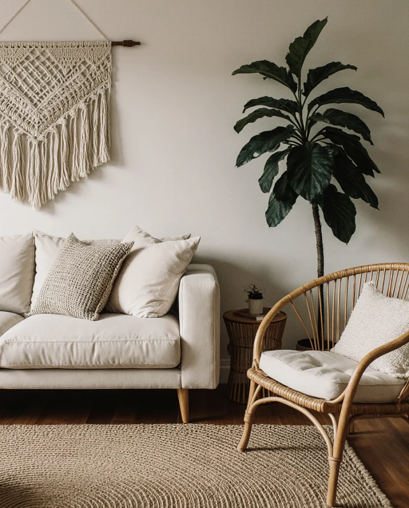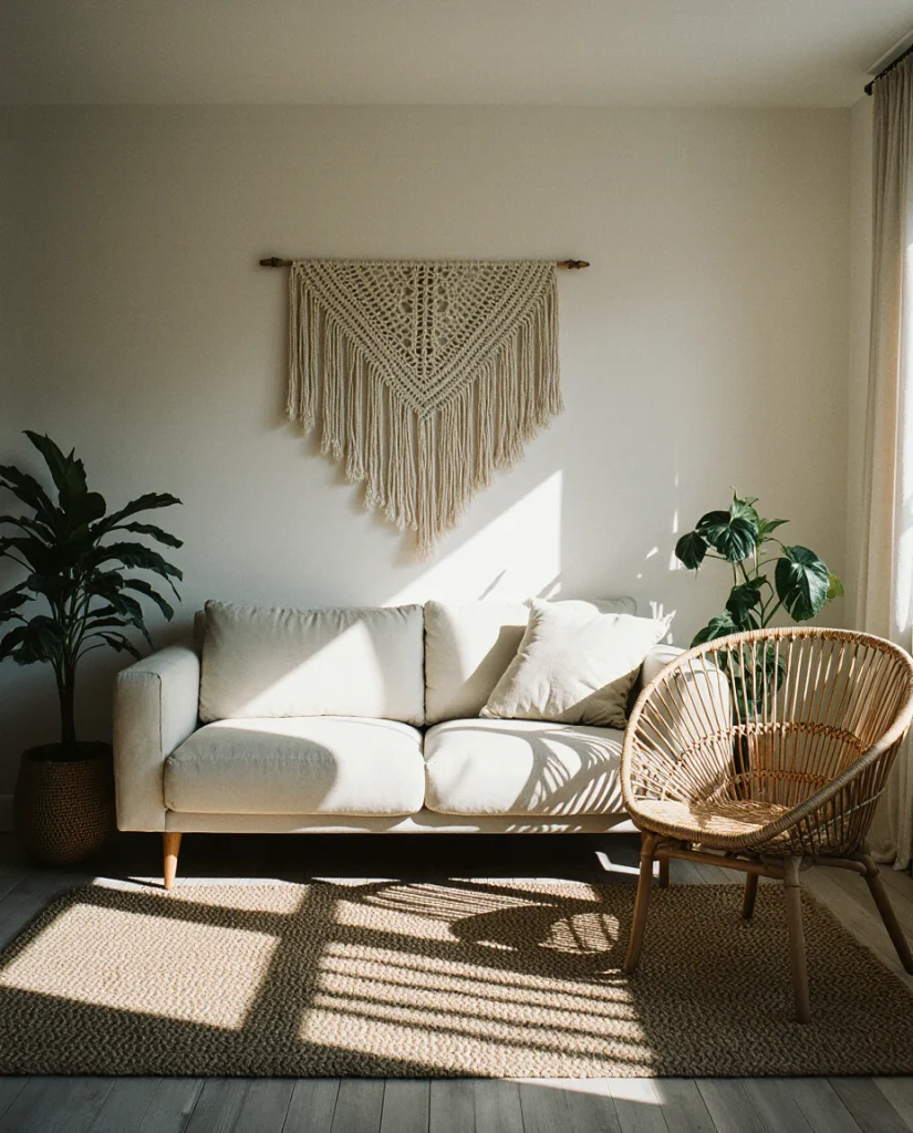 The intersection of cozy boho warmth and minimalist restraint creates living rooms that feel collected rather than cluttered. This style embraces natural textures—a chunky knit throw, a jute rug, and a macramé wall hanging—while maintaining clean lines and uncluttered surfaces. Bohemian elements like a single vintage rattan chair or a terracotta planter add personality without overwhelming the space. The trick is choosing pieces that serve both function and beauty, like a woven basket that stores blankets while adding visual interest to an empty corner.