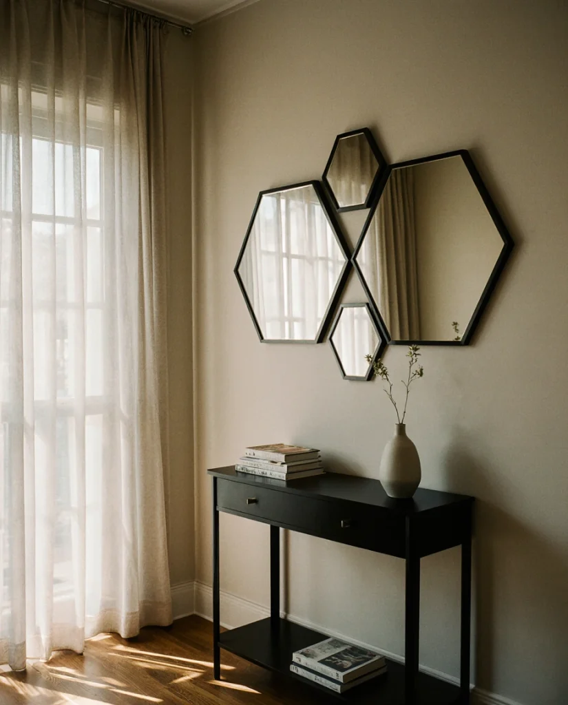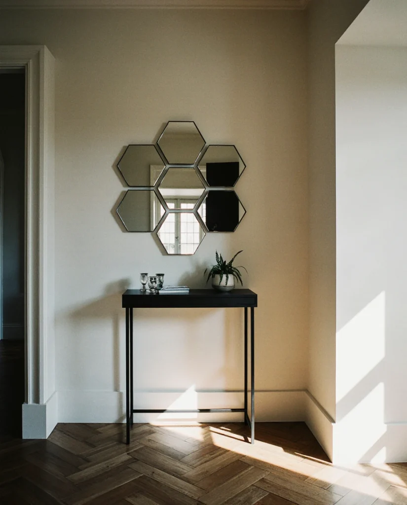 In urban areas such as Seattle or Boston, houses tend to be smaller. In these cases, hexagonal mirrors can trick the mind into seeing more depth. The fragmented mirrors make things look more dynamic, as do reflections, yet do not clutter the overall view, making them perfect for multirole corridor/gallery walls. Arrange the mirrors at eye level, maintaining 6–8 inches between the console and the lowest-hanging mirror. This maintains balance and feels more intentional compared to a more haphazard arrangement.