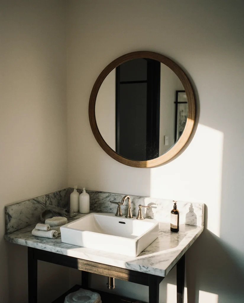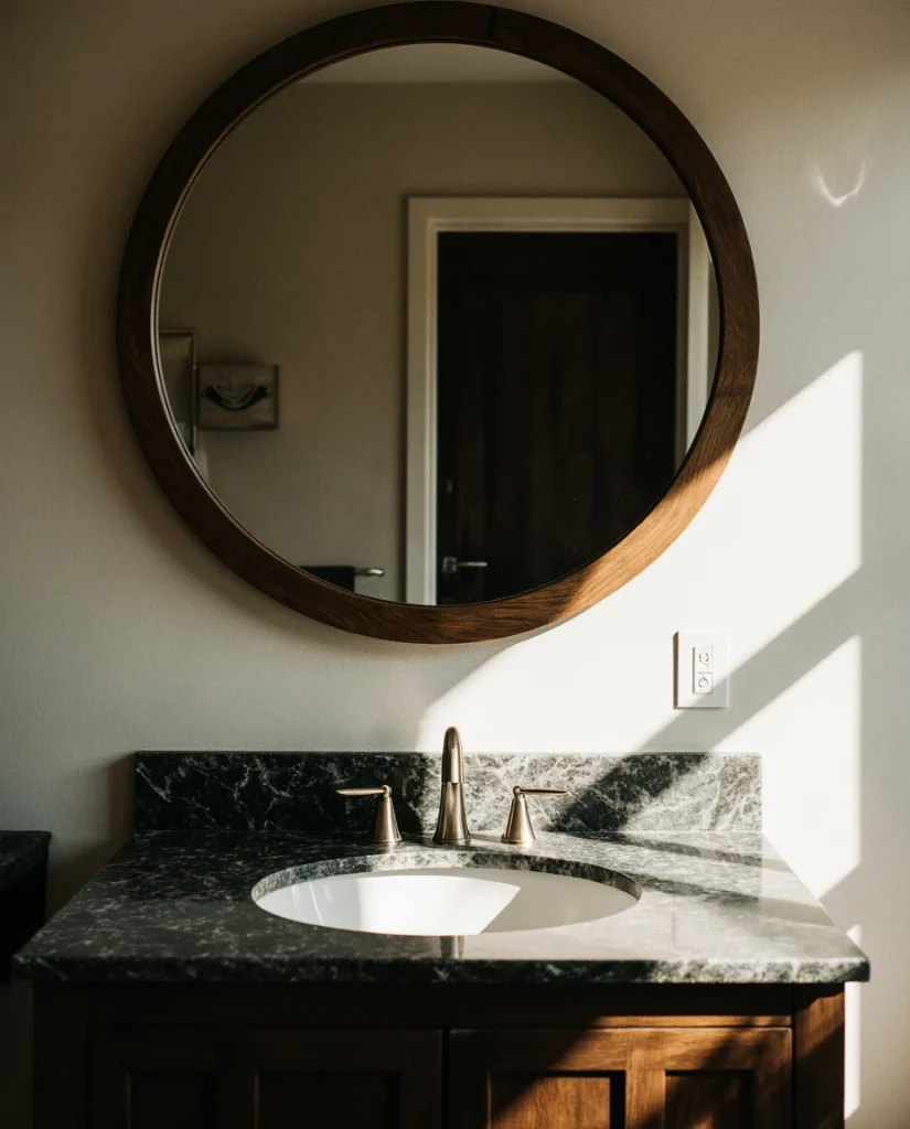 Common mistakes include choosing a mirror diameter that’s too small for double vanities—aim for 24-30 inches minimum to maintain proportion. Seal wooden frames properly in moisture-prone bathrooms to prevent warping; many homeowners discover water damage only after grout lines fail and steam penetrates unsealed wood. Pairing wooden mirrors with live-edge shelving or bamboo accessories creates a cohesive nature-inspired palette that feels grounded and calming.