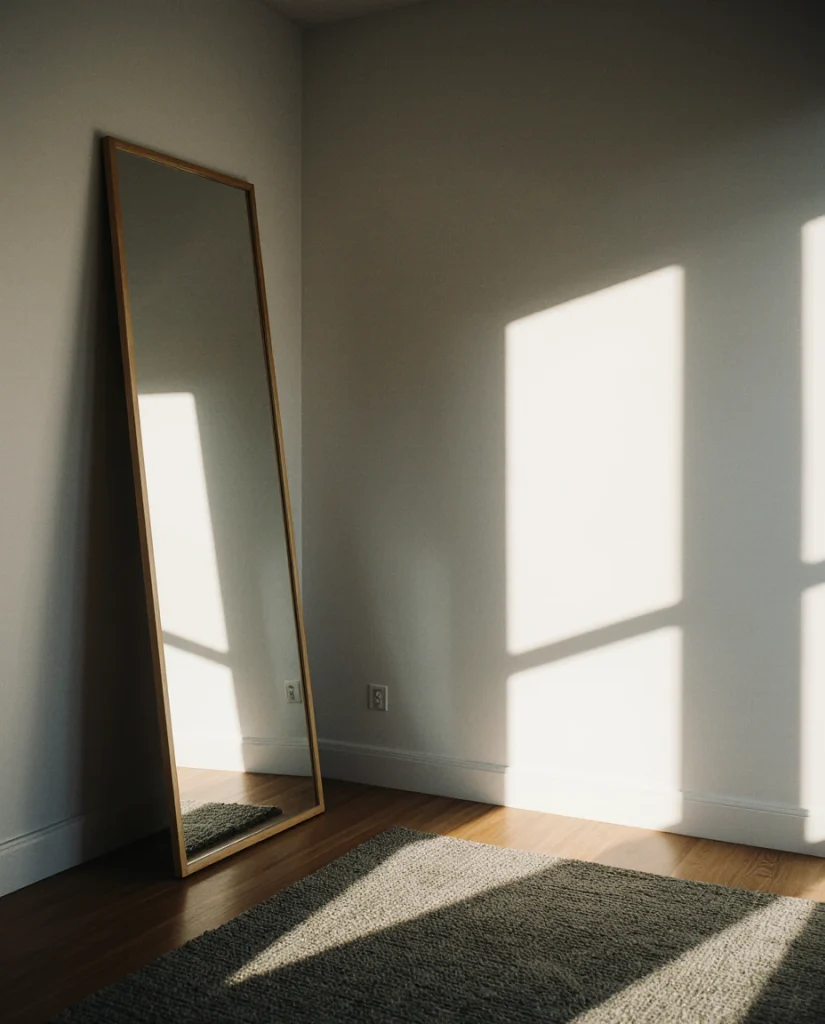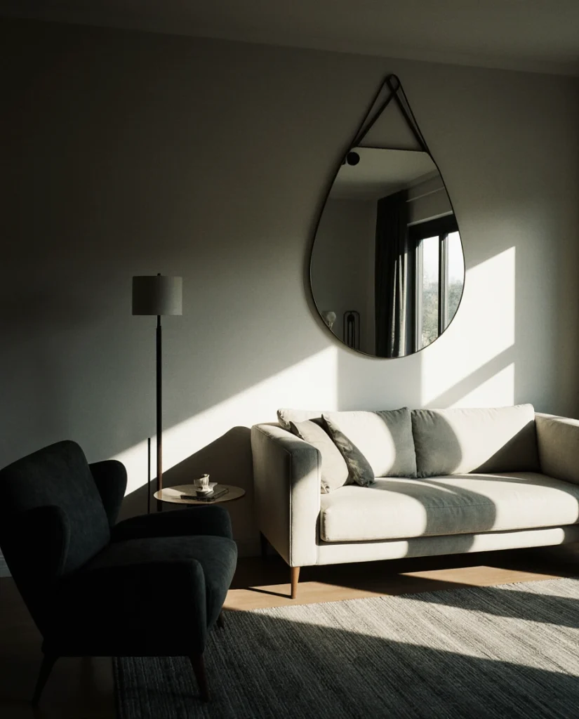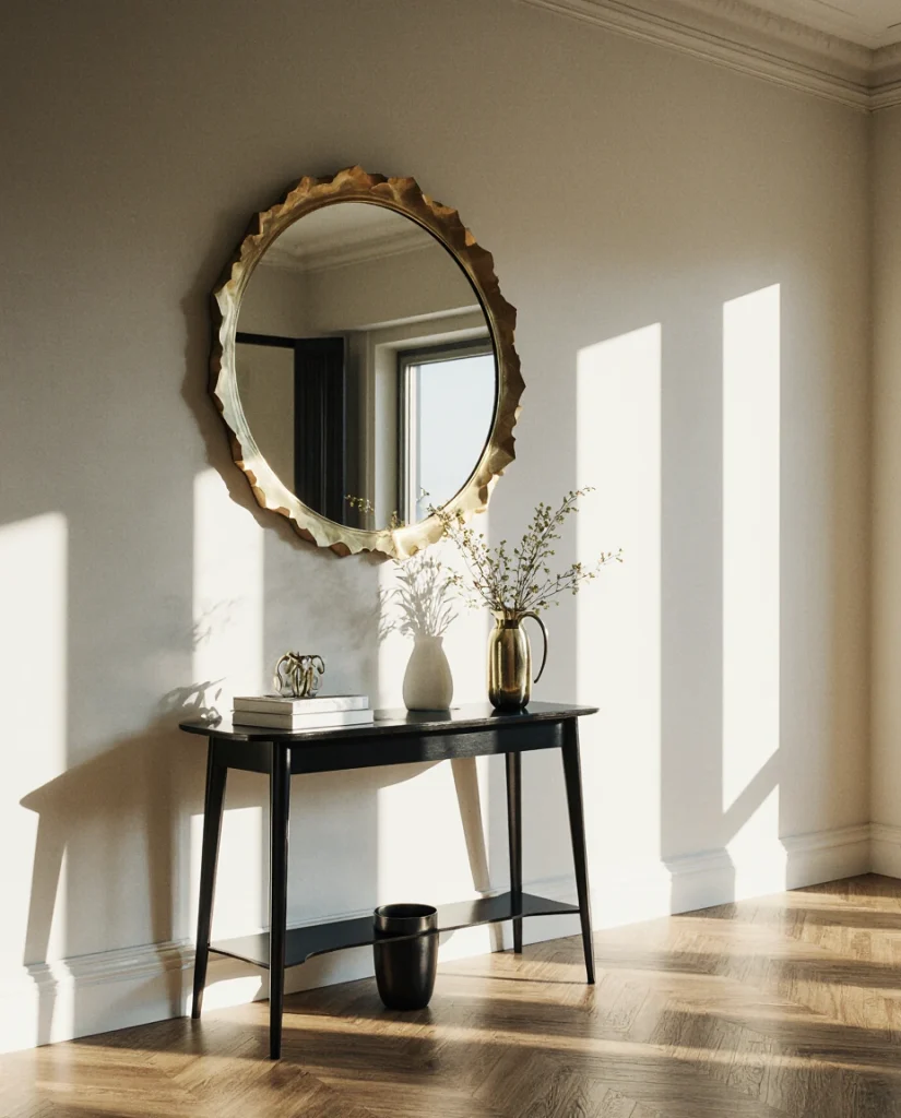 My neighbor recently installed a wavy-edge mirror above her console and mentioned how guests now ask about the “sculpture” rather than recognizing it as a mirror at first glance. This dual-purpose approach maximizes value in small homes where every piece needs to justify its footprint. Abstract mirrors pair well with minimalist furniture, allowing the irregular shape to stand out as the room’s primary decorative element without visual competition.