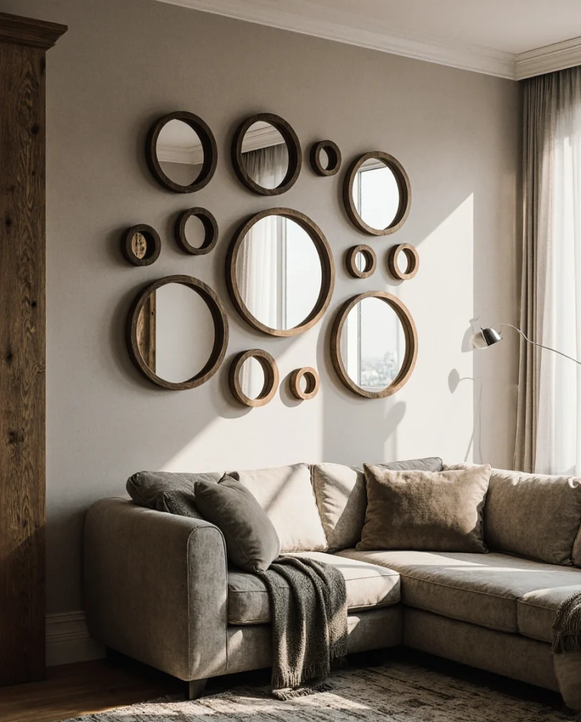 Arranging multiple circle mirrors in varying diameters across one wall creates a modern gallery that reflects light from changing angles throughout the day. This technique suits living room ideas for small spaces where traditional artwork might overwhelm limited square footage. Mixing metal finishes—brushed nickel with matte black—adds depth while maintaining cohesion through the repeated circular form.
