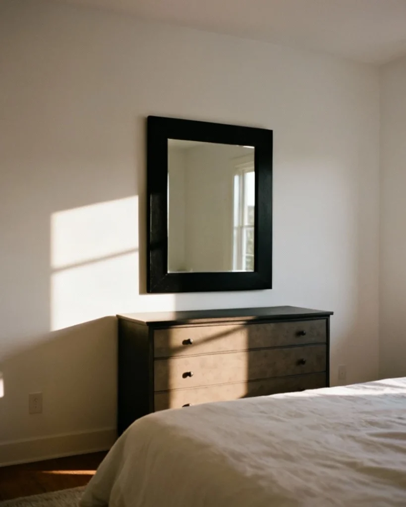 Selecting round or rectangular mirrors with carved wooden frames adds Old World elegance to bedroom aesthetics rooted in European or maximalist styles. Distressed finishes in ivory, sage, or charcoal suit eclectic interiors where mixing eras creates personality. These work beautifully in historic homes across New England and the Mid-Atlantic, where period-appropriate details enhance architectural character.