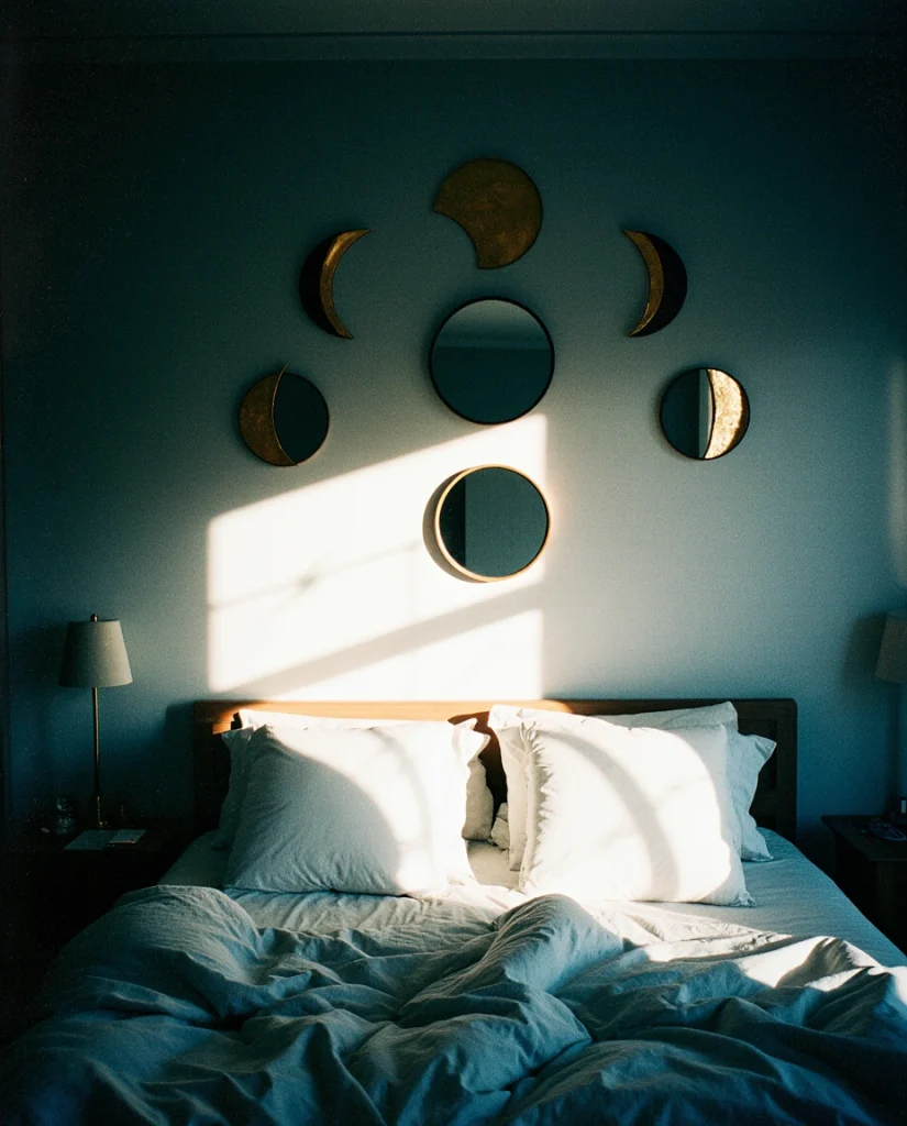 These moon-phase mirrors are often placed above headboards or along narrow walls where conventional artwork doesn’t fit. This collection contains 5–9 mirrors, each representing a stage in the moon cycle. As the eyes travel sequentially across the mirrors, it creates a lovely sense of movement. This blending of mirrors and decorative elements is lovely in eclectic interiors layered with bohemian decor, a style popular in creative communities like Portland and Asheville.