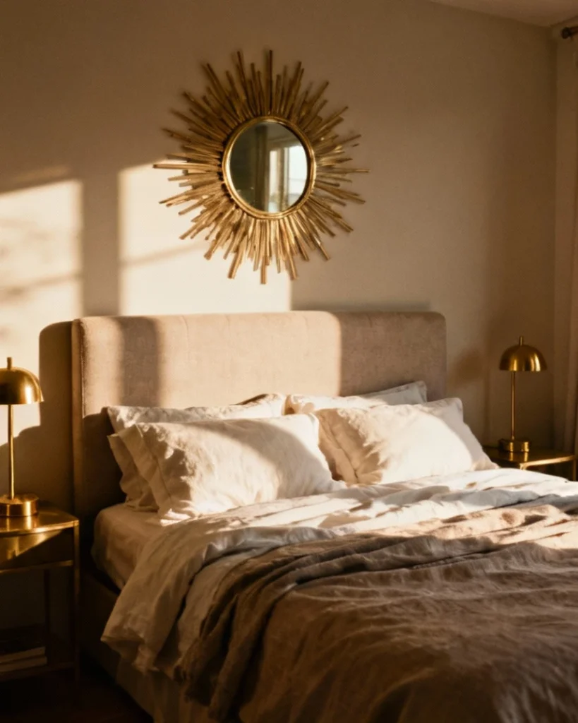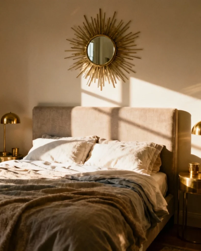 Mounting a sun mirror above the headboard in bedroom ideas layouts creates a radiant focal point that channels mid-century glamour. The starburst rays add texture and dimension to otherwise flat wall surfaces, particularly effective in minimalist spaces where ornamentation is kept intentional. Metallic finishes—from antique brass to polished nickel—let you tie the piece into existing lighting fixtures and drawer pulls.