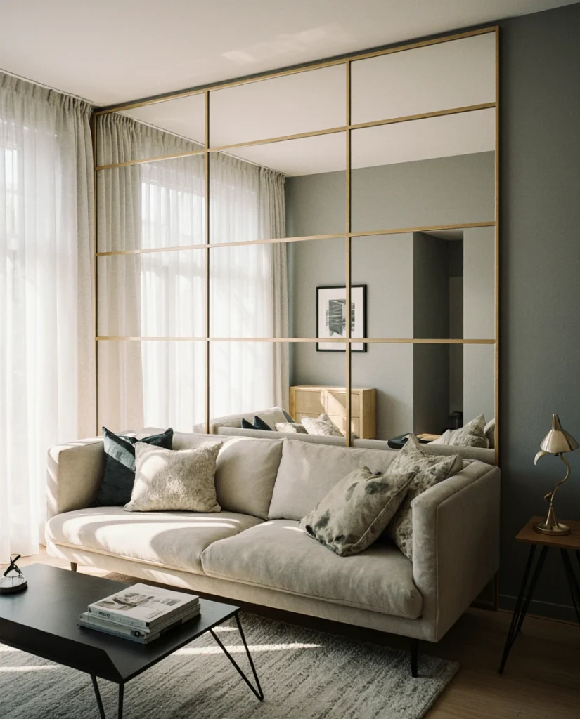 Installing square mirror tiles in a uniform grid transforms entire walls into reflective surfaces that enlarge small spaces dramatically. This technique is popular in living room ideas for small spaces and simple arrangements where every square foot counts. The grid structure adds architectural rhythm while maintaining clean, contemporary lines that suit urban lofts and modern condos.