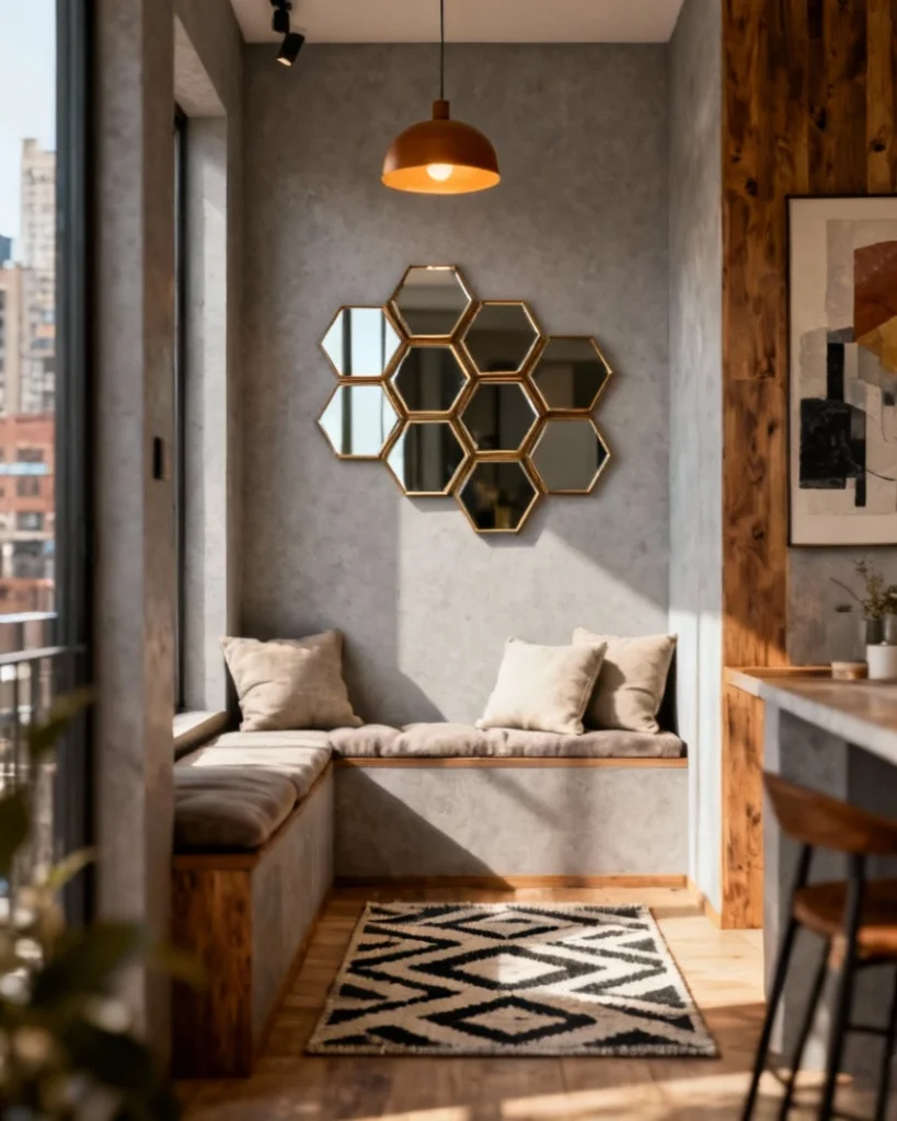 Incorporating hexagon or diamond mirrors with brass frames brings Art Deco glamour to entrance areas and powder rooms, popular in historic districts from Charleston to San Francisco. The warm metallic tone complements both cool and warm palettes, offering versatility as color schemes evolve. Clustered arrangements or solo statements both work, depending on available wall space.