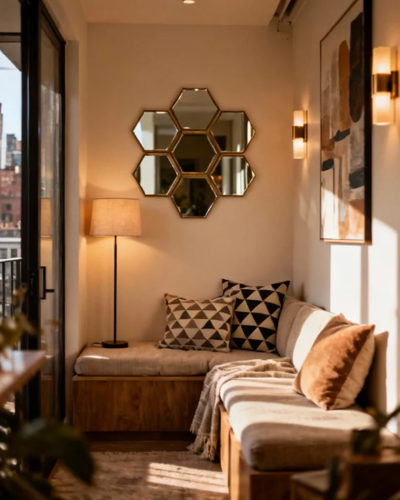 Combining circle, hexagon, and rectangle mirrors in an asymmetric composition creates gallery-style impact in living room ideas for small spaces where every wall needs to work hard. The varied shapes prevent monotony, while the cohesive finish—all brass or all black—maintains unity. This approach suits eclectic and transitional interiors where blending styles defines the overall aesthetic.
