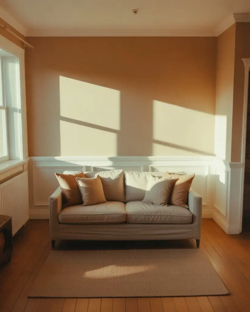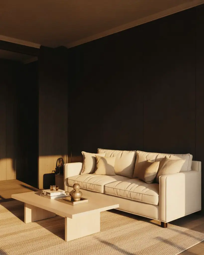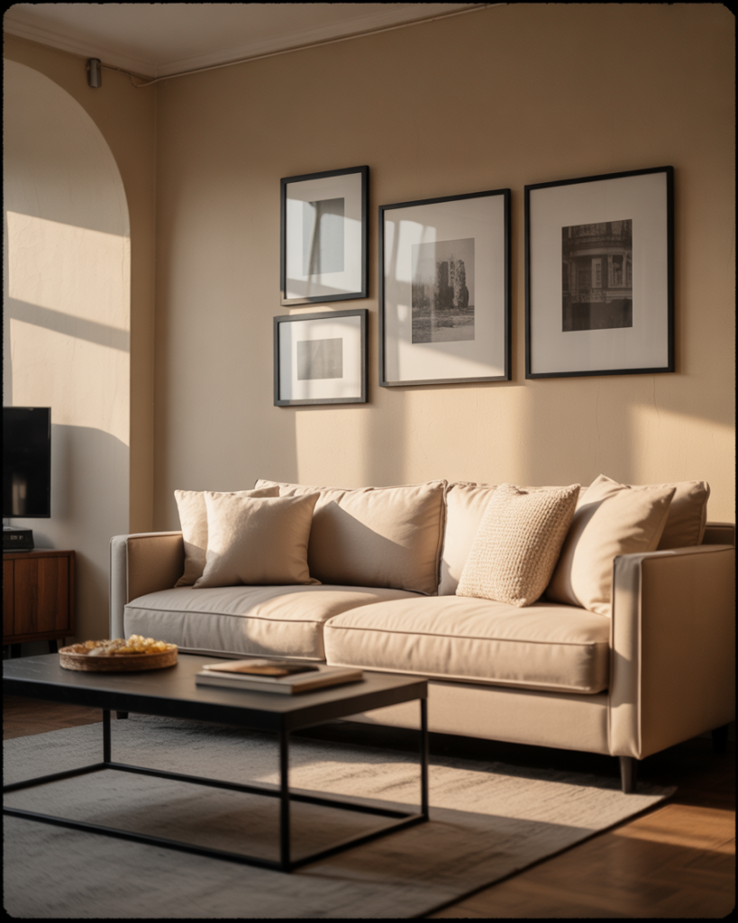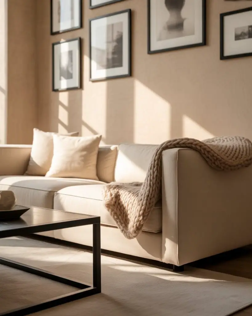 Start with a foundation of warm beige walls and a tonal sofa, then introduce black accents through picture frames, a slender floor lamp, or a low coffee table. This combination feels cozy without leaning too traditional, and the contrast adds just enough edge to keep the room from feeling flat. It’s a popular choice for apartment dwellers who want sophistication without heavy furniture or bold color commitments.