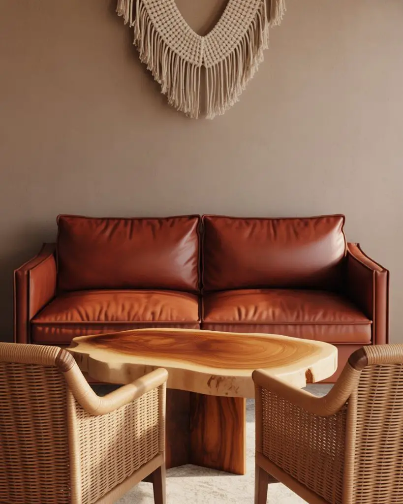 Embrace the full spectrum of decor earth tones—burnt sienna, ochre, clay, and sand—anchored by natural wood furniture. A live-edge coffee table, rattan side chairs, and woven wall hangings bring the outdoors in. This aesthetic feels grounded and connected to nature, a direct response to the overly polished, all-white trends of the past decade.