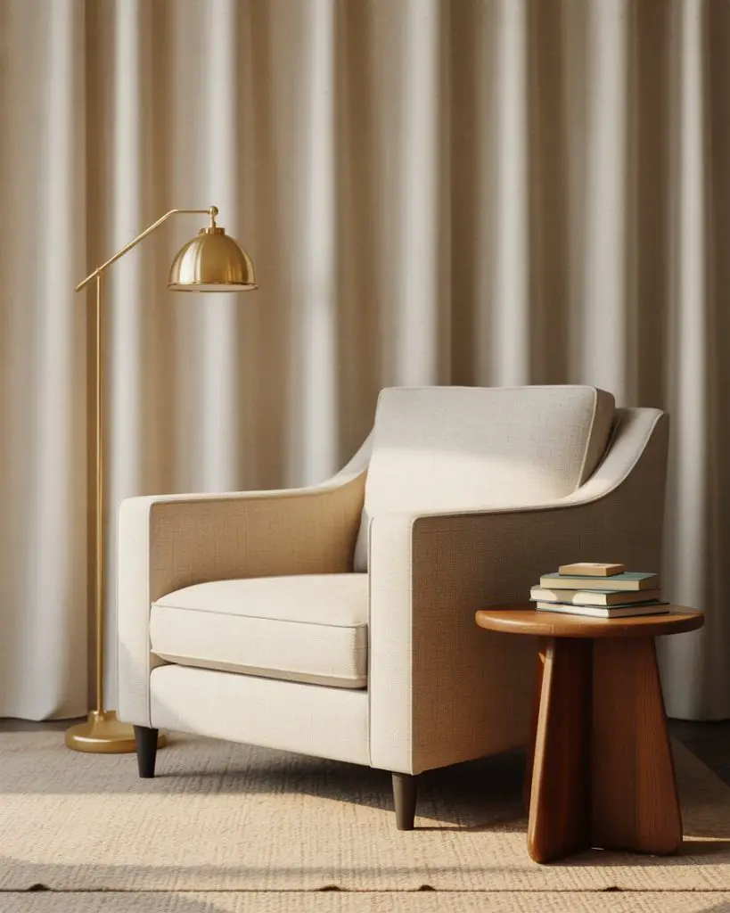 Carve out a corner with an oversized chair in oatmeal linen, a floor lamp with a warm bulb, and a small side table stacked with books. The goal is to create a cosy retreat within your living room—a spot that invites lingering. Neutral tones here feel intentional, not boring, because the function is so clear and the textures are so inviting.