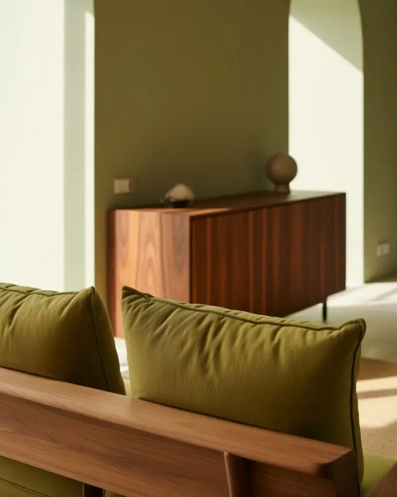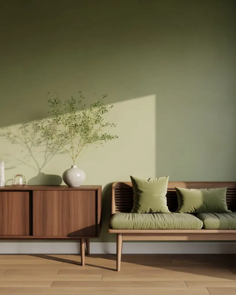 Pair a muted green and natural wood for a look that feels both modern and timeless. Think a sage accent wall behind a walnut credenza, or olive cushions on a teak bench. The combination is inherently calming and works across design styles, from Scandinavian to mid-century to farmhouse. It’s also highly adaptable as trends shift.