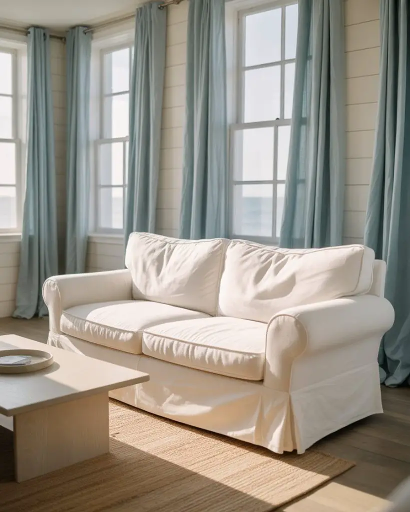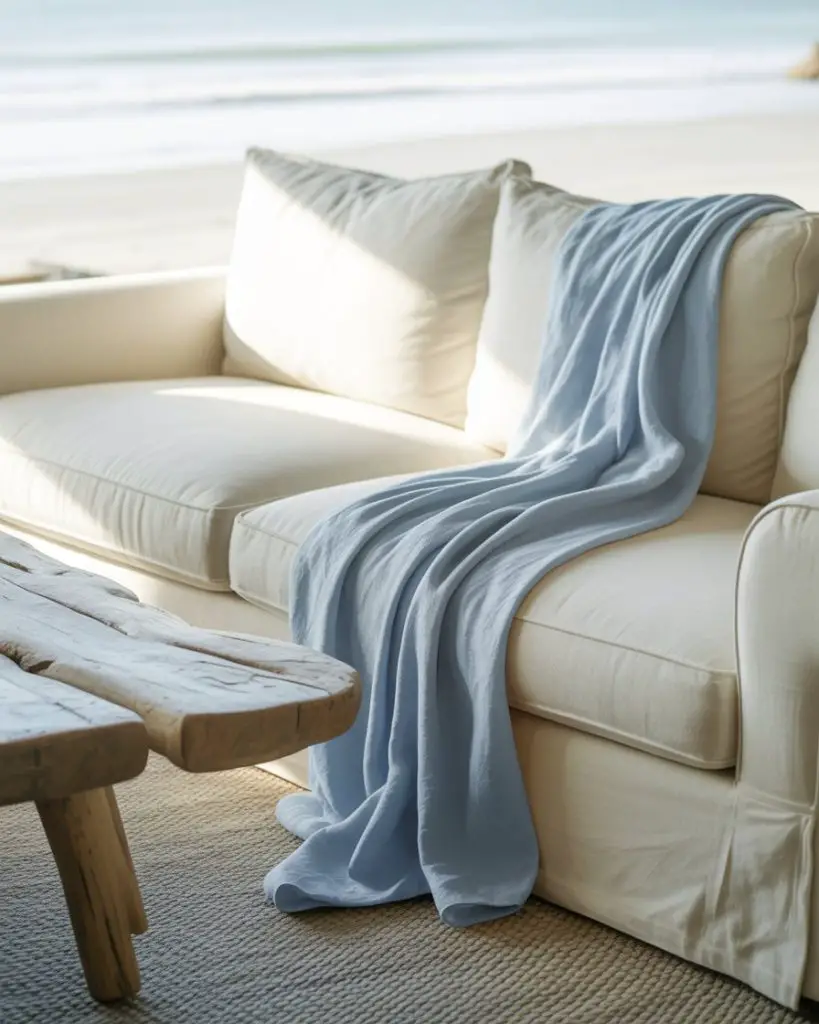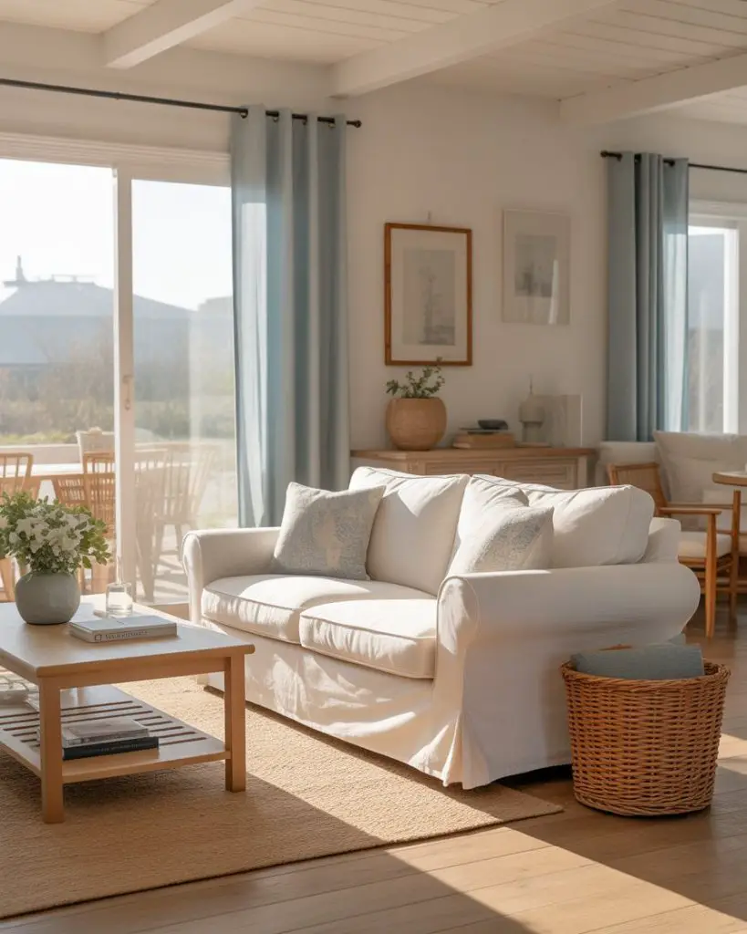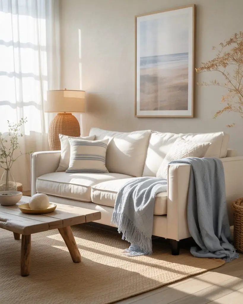Bring the beach indoors with a soft sand and white palette accented by coastal blues—powder blue, seafoam, or even a muted navy. Think linen slipcovers, driftwood decor, and woven textures that nod to shoreline living. Blue accents can appear in throw blankets, ceramic bowls, or a single accent chair that anchors the seating area.